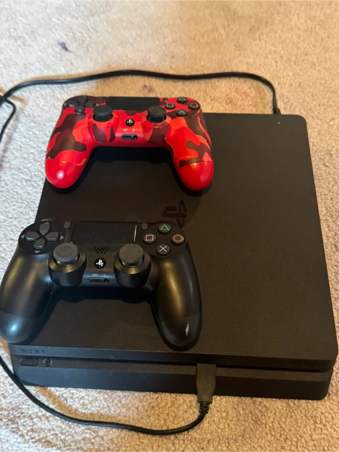 Selling a used PlayStation 4 with two controllers. One controller is black and the other is red camo. Great for some gaming fun!