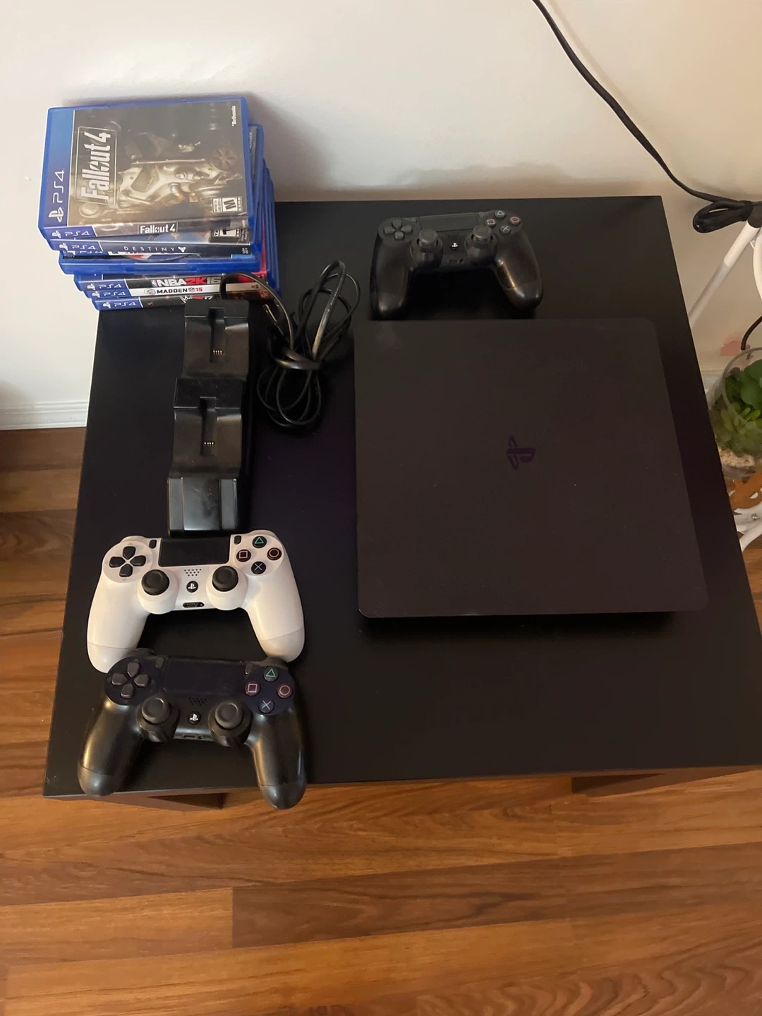 65Selling a PlayStation 4 with several games and three controllers! Includes games like Fallout 4, NBA 2K16, Destiny, and Madden 15 (eight game cds). Comes with a controller charging dock and three controllers (two black, one white)