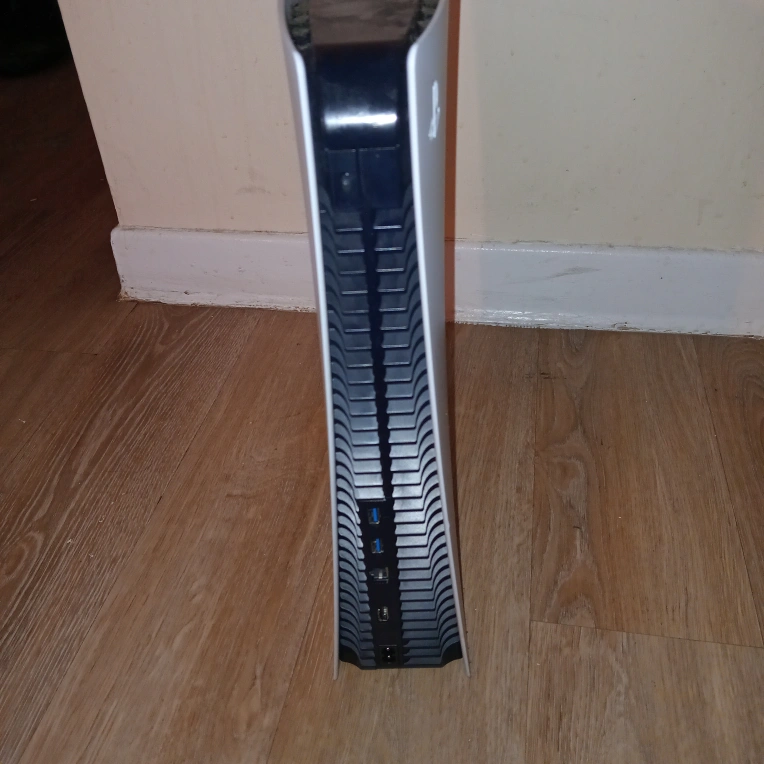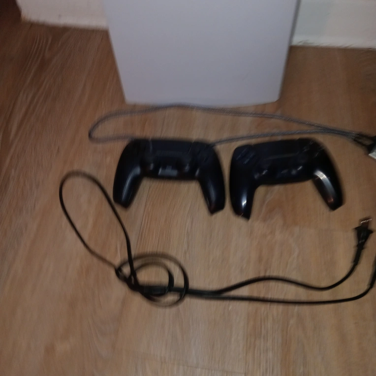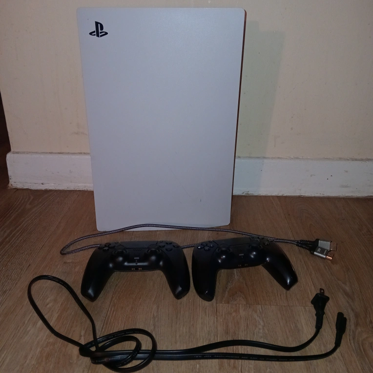 Pre-owned PlayStation 5 console. Includes two DualSense wireless controllers and power cables. Digital PlayStation 5 edition.