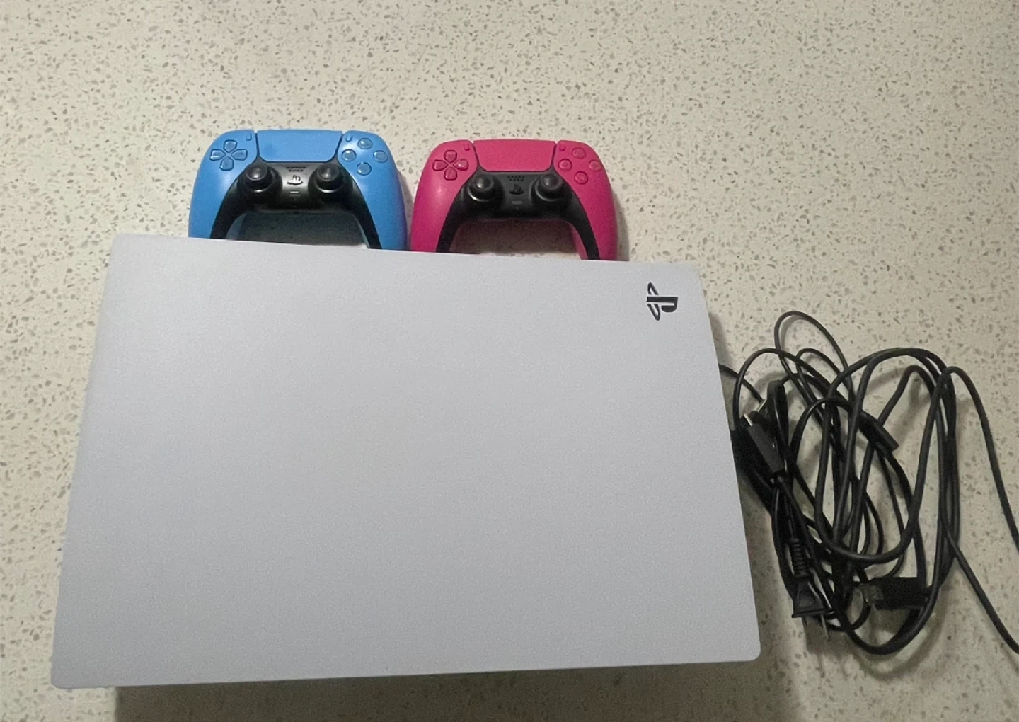 60Selling a PlayStation 5 console in great condition! It comes with two controllers, one in blue and one in pink. Also includes the necessary power cable to get you gaming right away