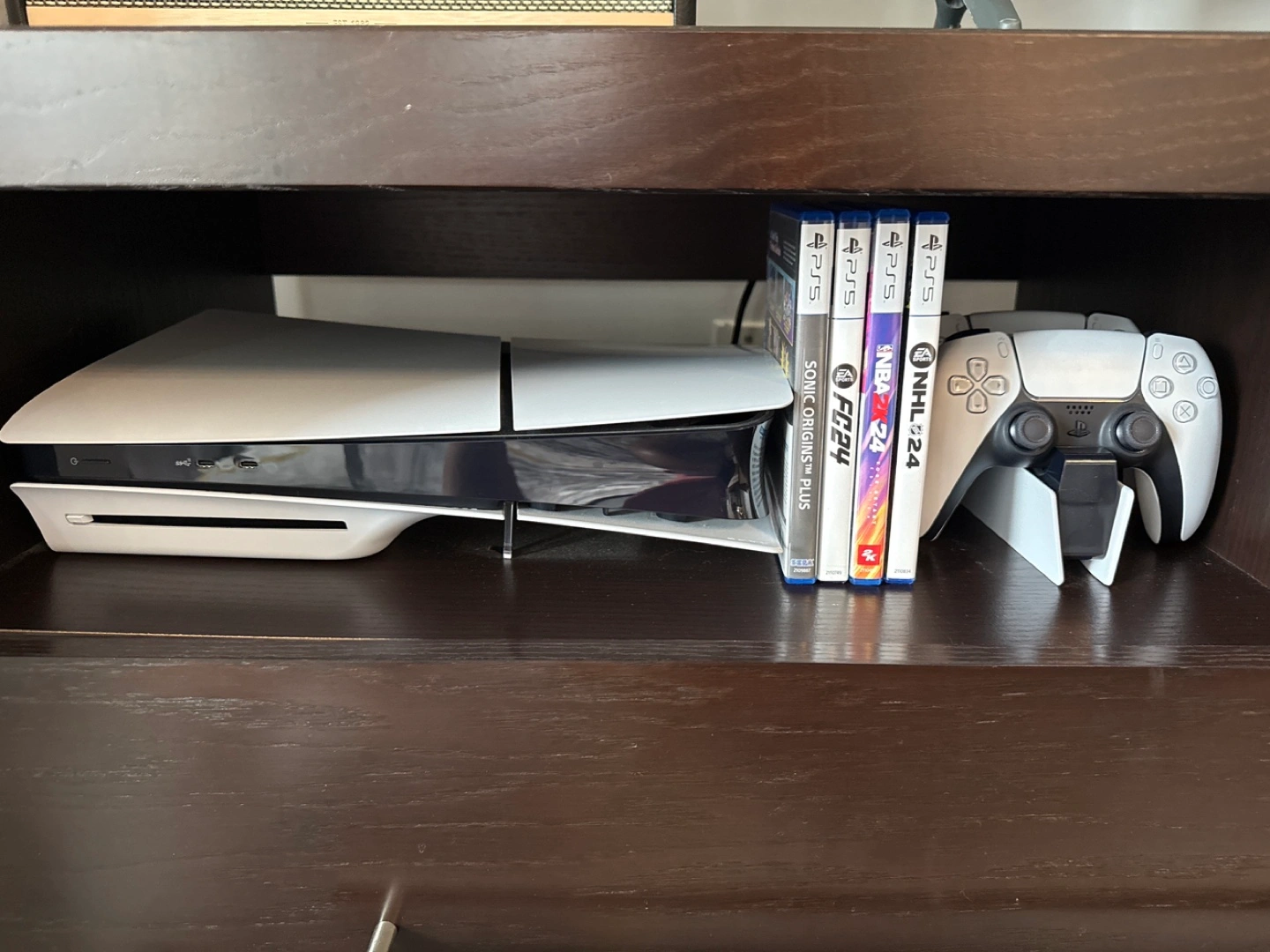 65Selling a PlayStation 5 console along with a controller and a few games: Sonic Origins Plus, FC 24, NBA 24, and NHL 24. Great for anyone looking to jump into gaming! - 2 controllers - wireless charger for controllers Used a few times - Got as gift from best buy.