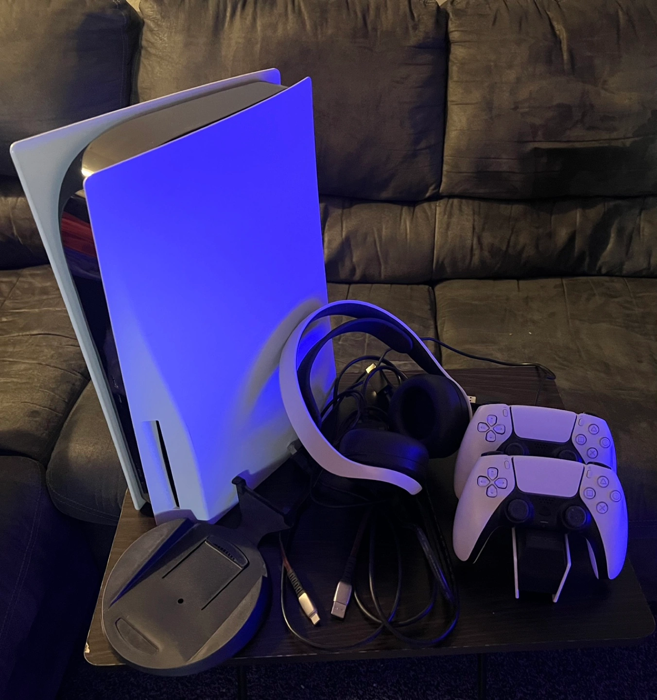 Disc edition Console, headset, 2 controllers, and charger stand. Cables included.