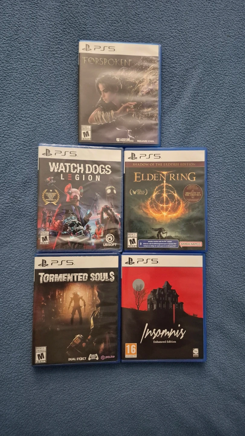 145Excellent condition Like new to new Forspoken $15 Watchdog Legion $20 Elden ring (code used) $30 Tormented souls $25 Insomnis $25 Or all for $110