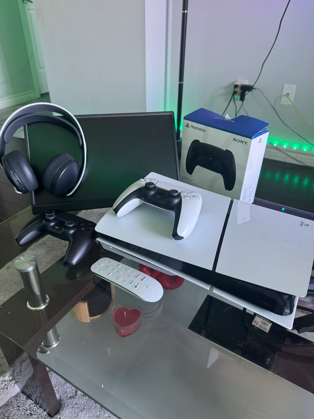 65Selling a PlayStation 5 bundle! Includes the console, two controllers (one Midnight Black), a media remote, and a headset. Everything is in great condition and ready for use