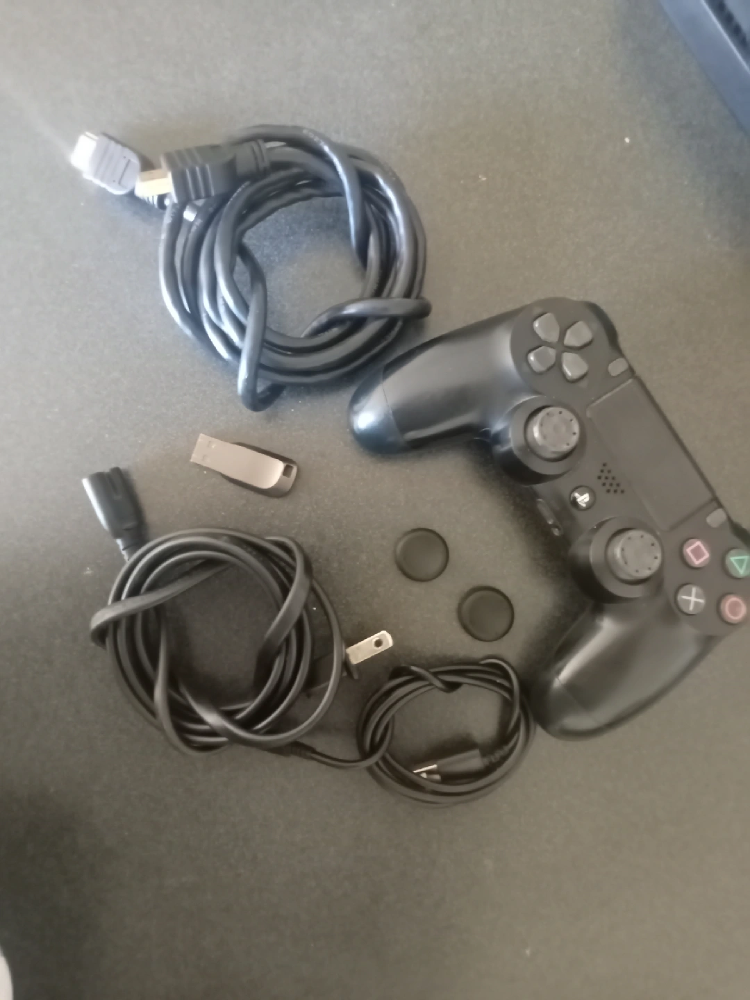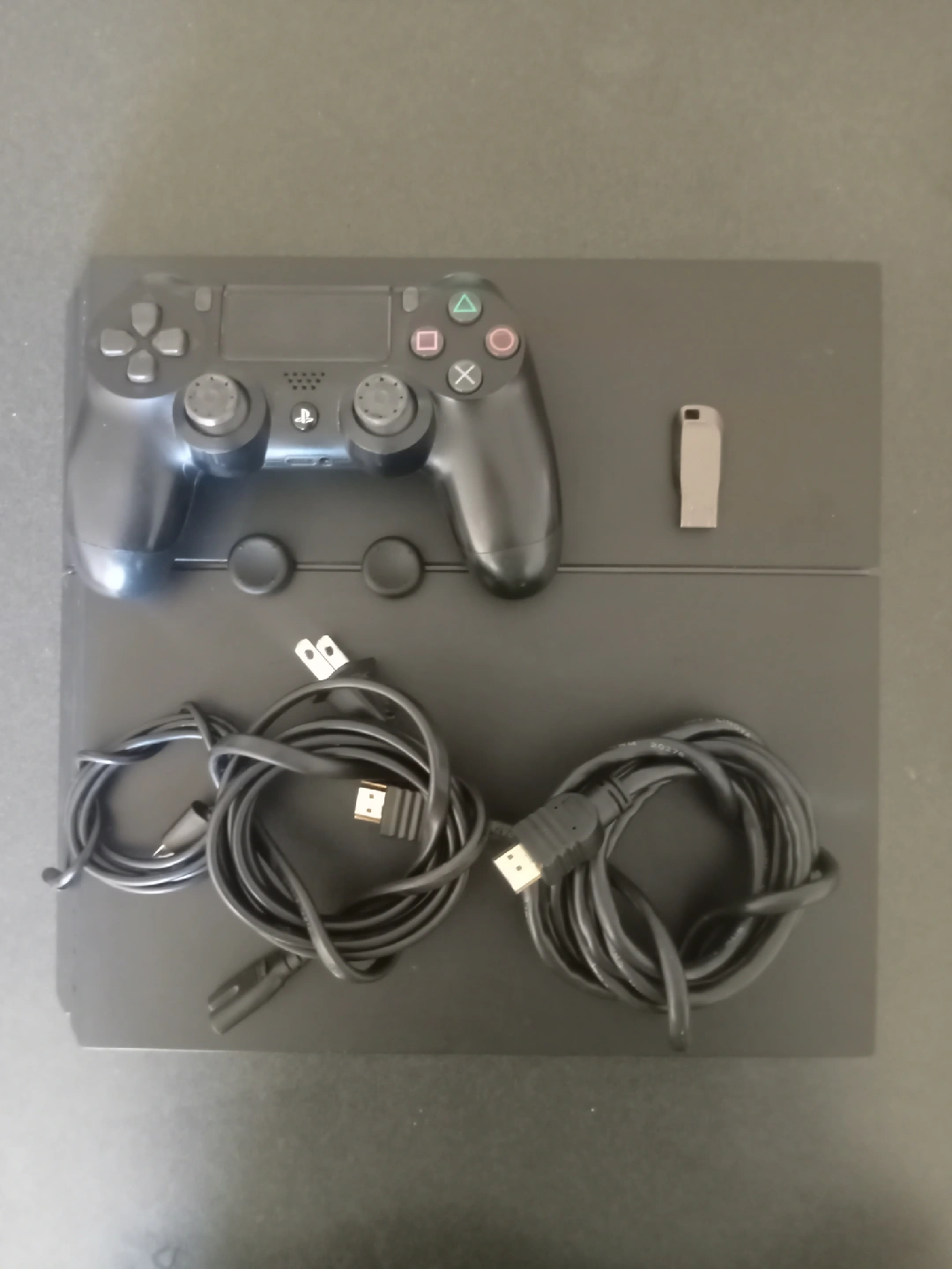 PlayStation 4 1 controller with hdmi cord and power ac cord with 1 USB_A for ps4 controller 500gb storage model with Samsung usb 3.0 128gb storage drive formatted under xfat