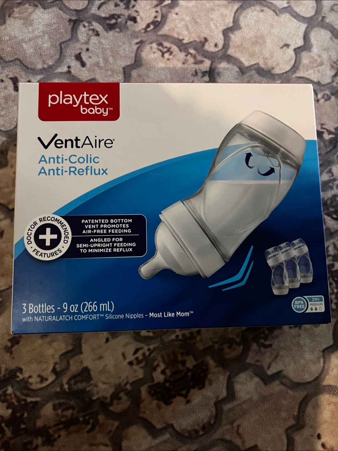 Three 9 ounce Playtex Ventaire Anti-Colic and Anti-Reflux baby bottles. Patented bottom for air-free feeding. Angled for semi-upright feeding to minimize reflux. Includes three medium nipples. BPA free.