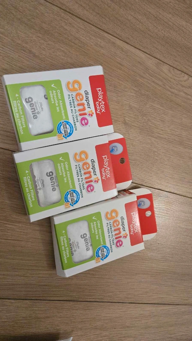 10I'm selling three packs of new Playtex Diaper Genie carbon filters that effectively absorb odours to keep your nursery fresh. Each pack contains 4 carbon filters. Easy to install. Keeps nursery fresh. Keep your nursery smelling like a field of daisies (or at least not like a diaper pail)! Grab these filters and breathe easy. If the ad is up, they're still available!