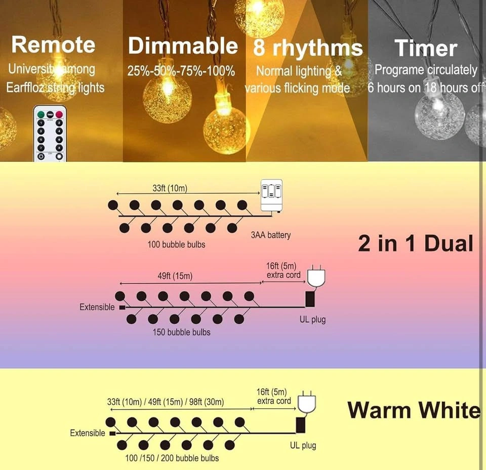 10Plug-in Globe String Lights (Warm White), 10m 33ft 100 LED Remote Control Timer 8 Modes Dimmable IP44 Weatherproof Bubble Lighting for Outdoor Indoor Decor