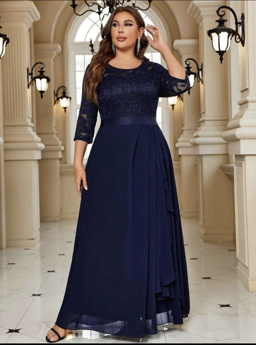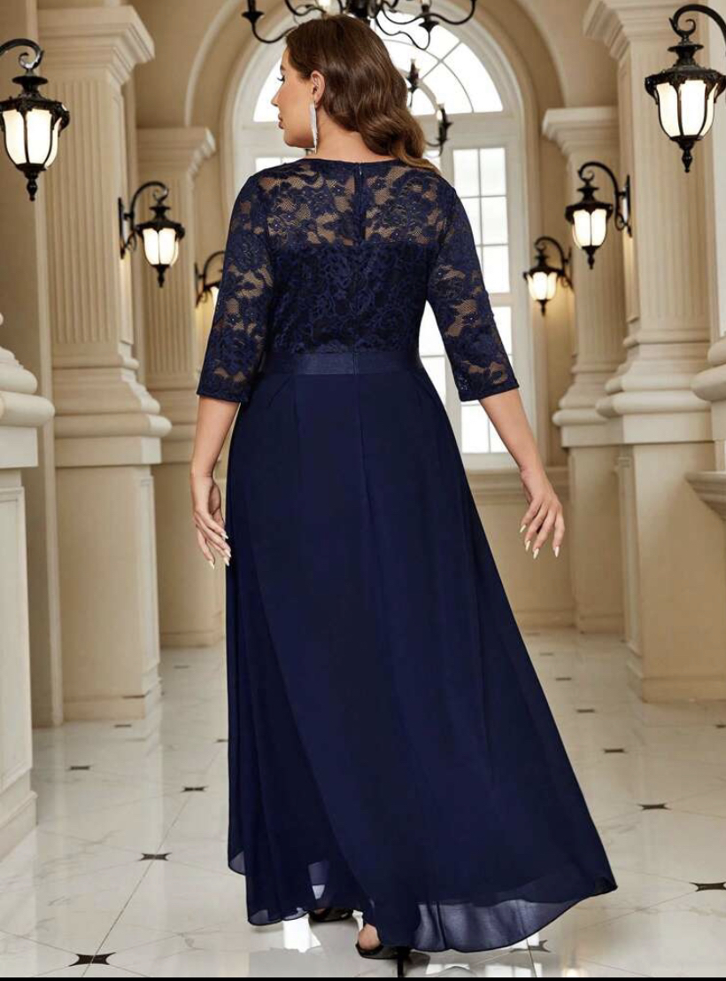 499NWT! SHEIN Plus Lace Bodice Ruffle Trim Chiffon Formal Dress Beautiful dress, zipper in the back Flows nicely Navy blue colour Size 1XL