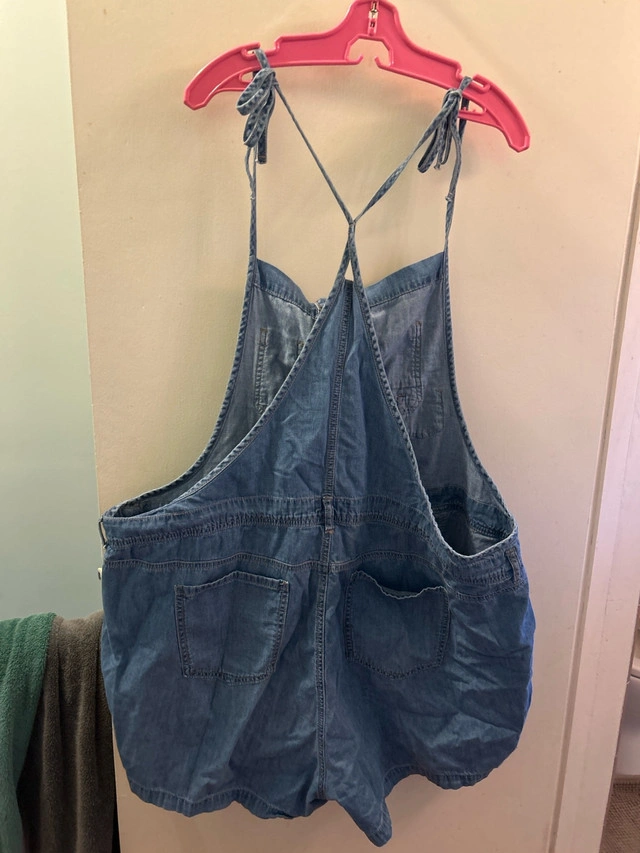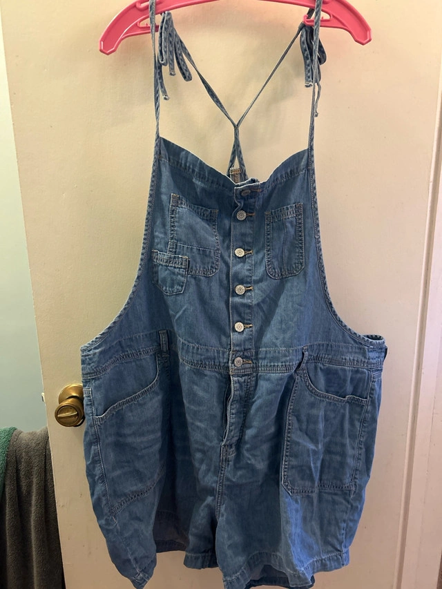 60These cute denim short overalls feature adjustable straps and a button-up front. They're perfect for a casual day out! The overalls are in good condition, showing some signs of wear, which only adds to their charm. Specifications: * Style: Overalls * Material: Denim * Closure: Button * Straps: Adjustable * Size: 4x Looking at similar listings on Kijiji, a reasonable price for these gently loved overalls is $20. If the ad is up, the item is available!