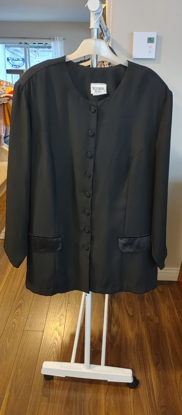 0Selling a black blazer from East West Woman. It's a classic piece with a button-down front and false pocket detailing. Perfect for adding a touch of sophistication to any outfit!