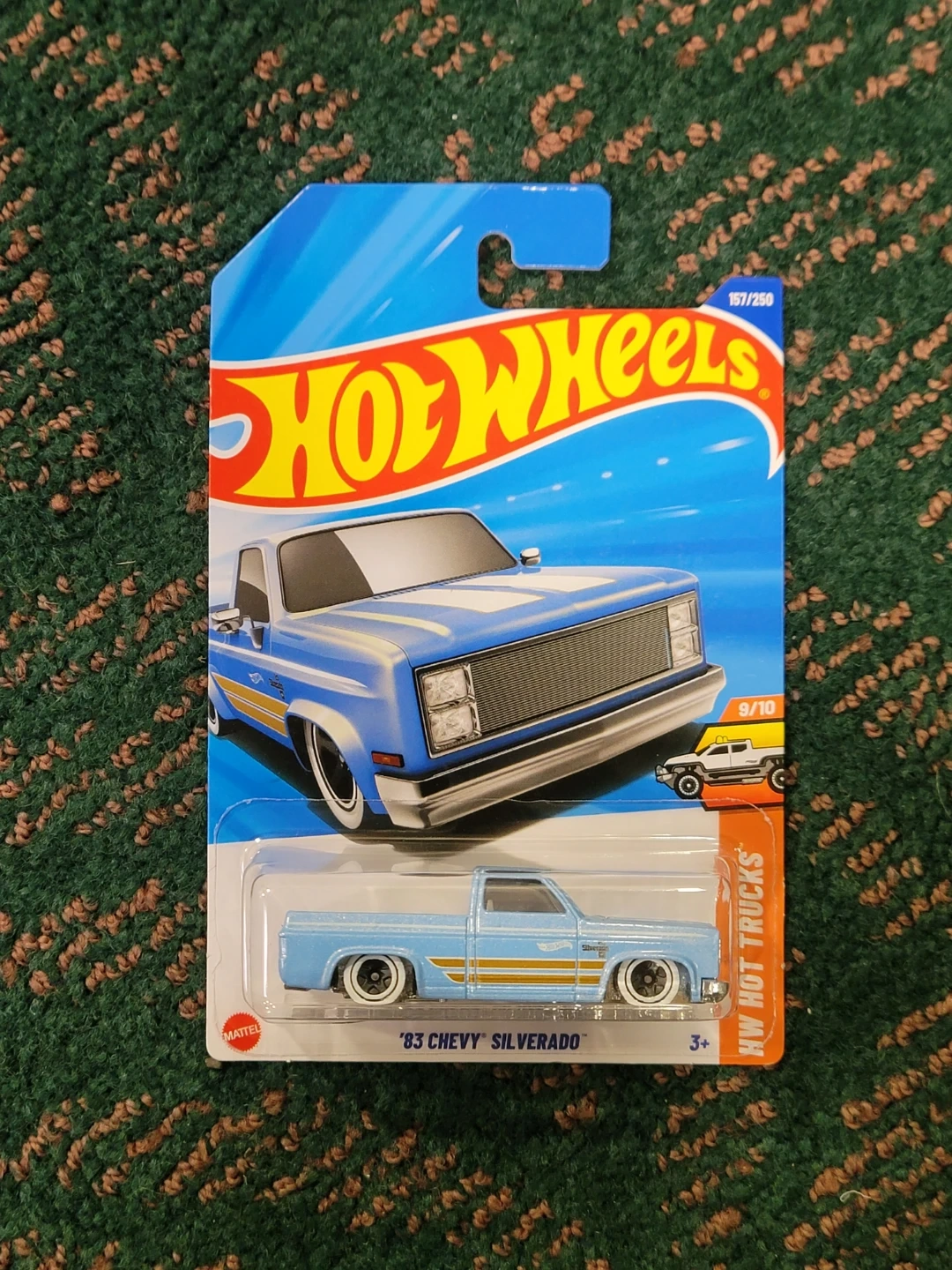 This is a blue '83 Chevy Silverado Hot Wheels die-cast toy truck. It's part of the HW Hot Trucks series and is in its original packaging.