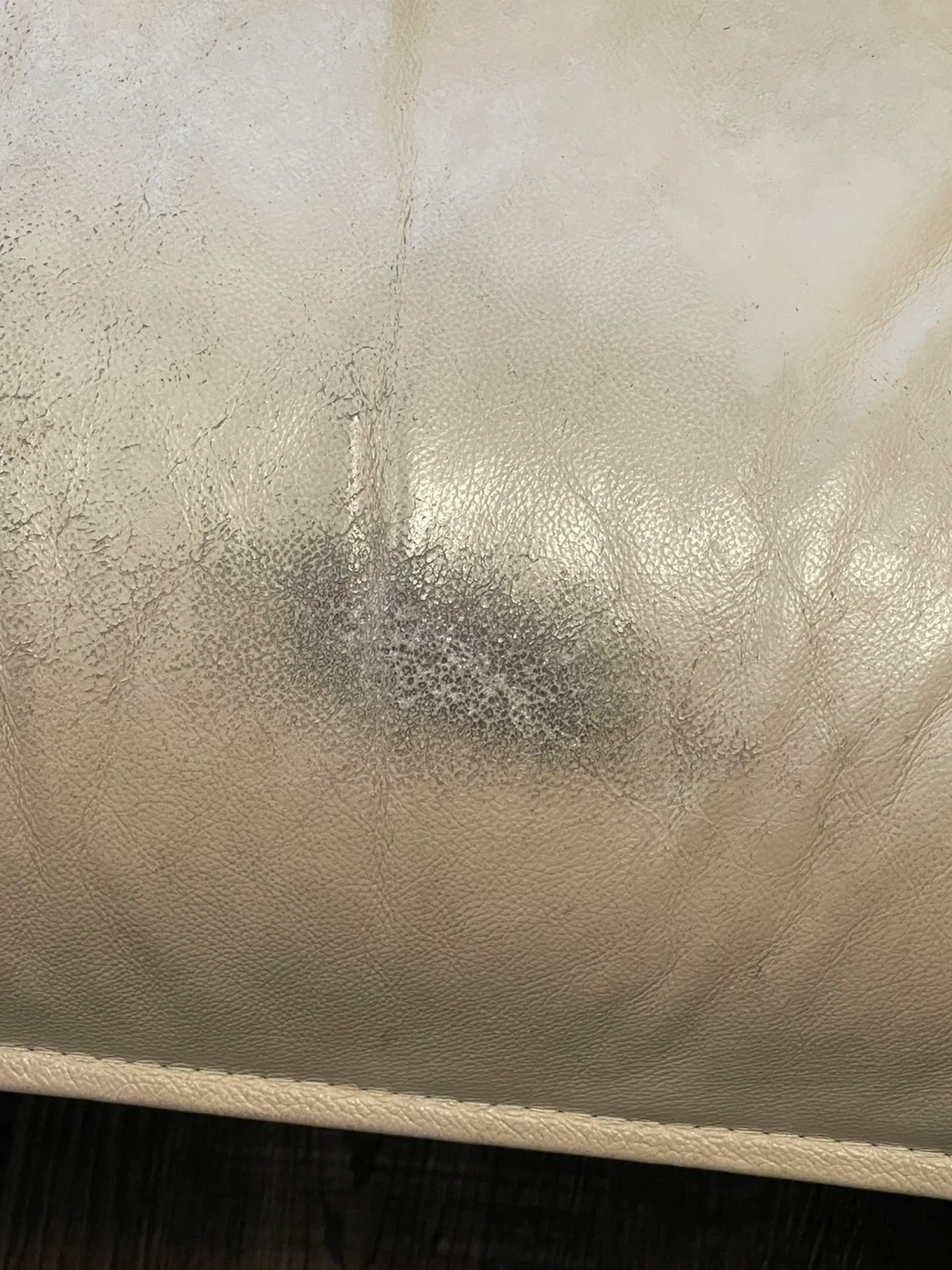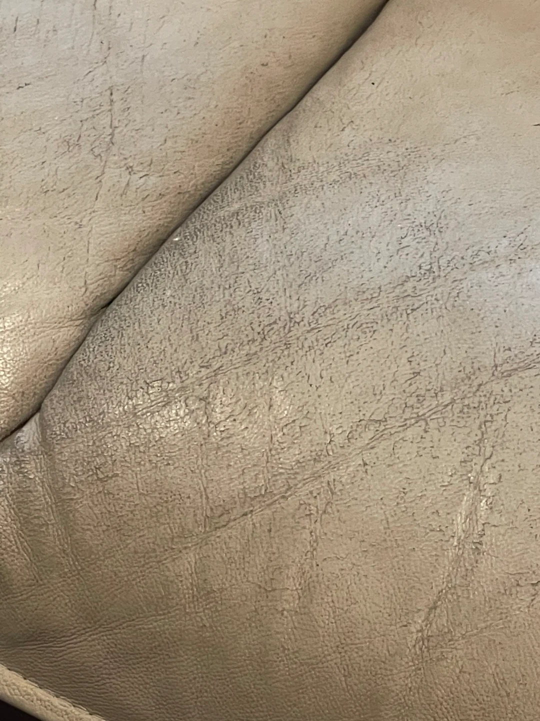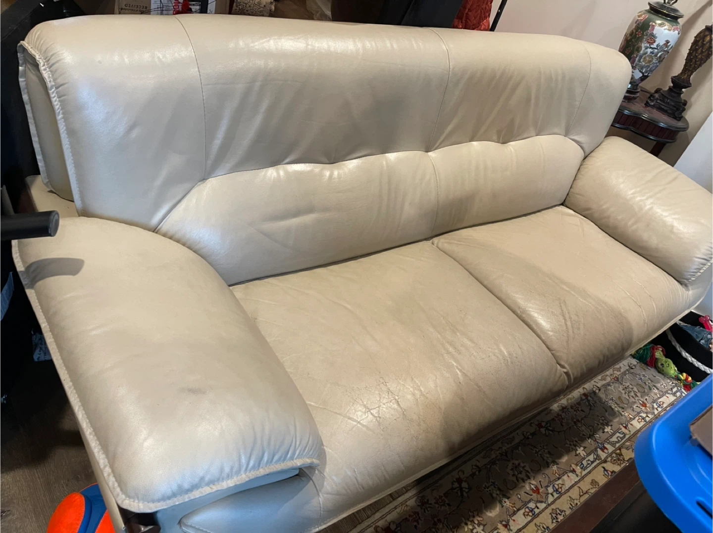 Two peace cream leather sofa with a dark wood trim. Shows signs of wear, including discolouration and minor cracking on the seat cushions. It's a comfortable two-seater.