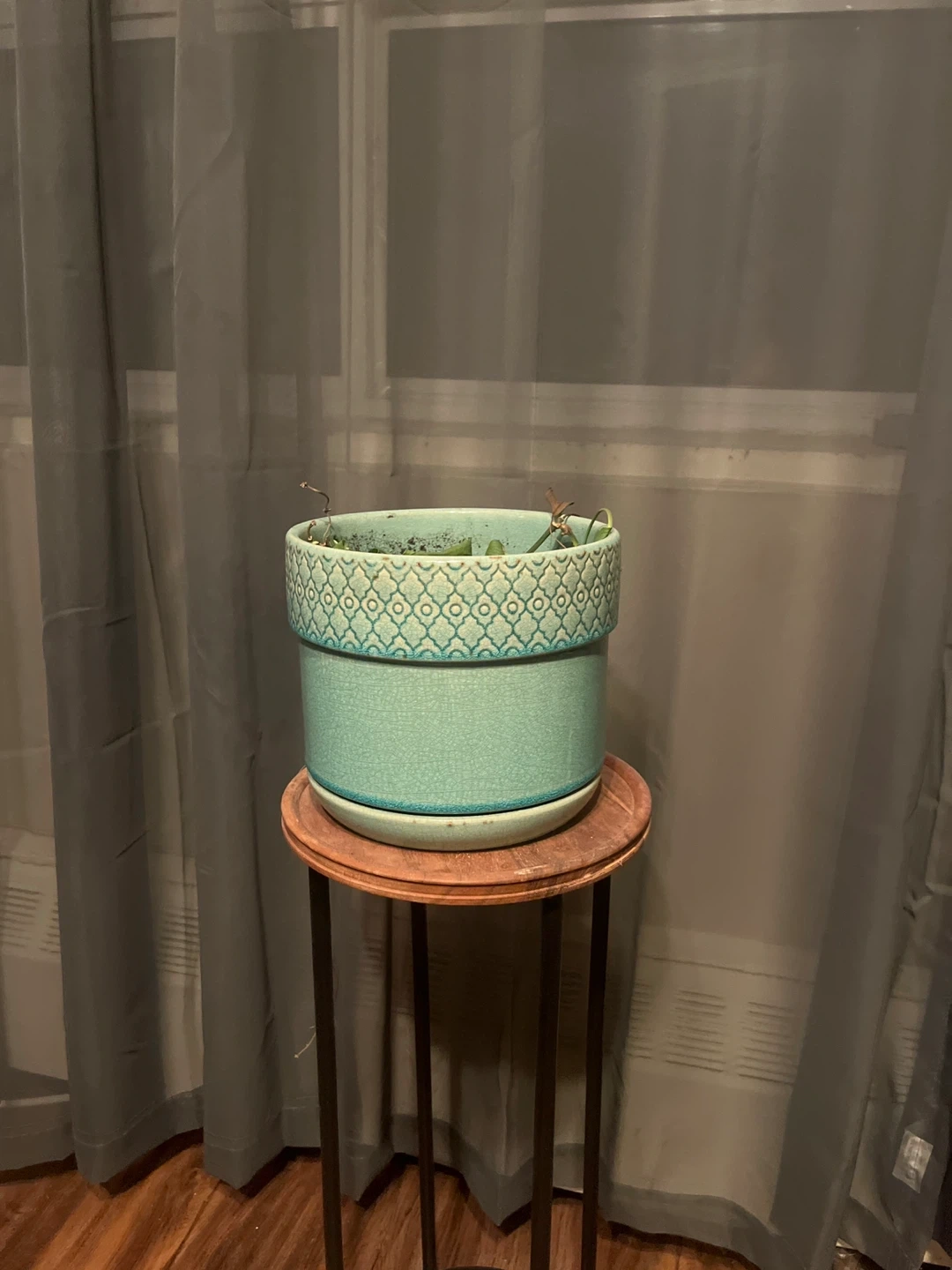 This is a decorative ceramic plant pot with a teal-ish blue colour and a textured pattern around the rim. It has a matching saucer. It's about 6 inches tall.