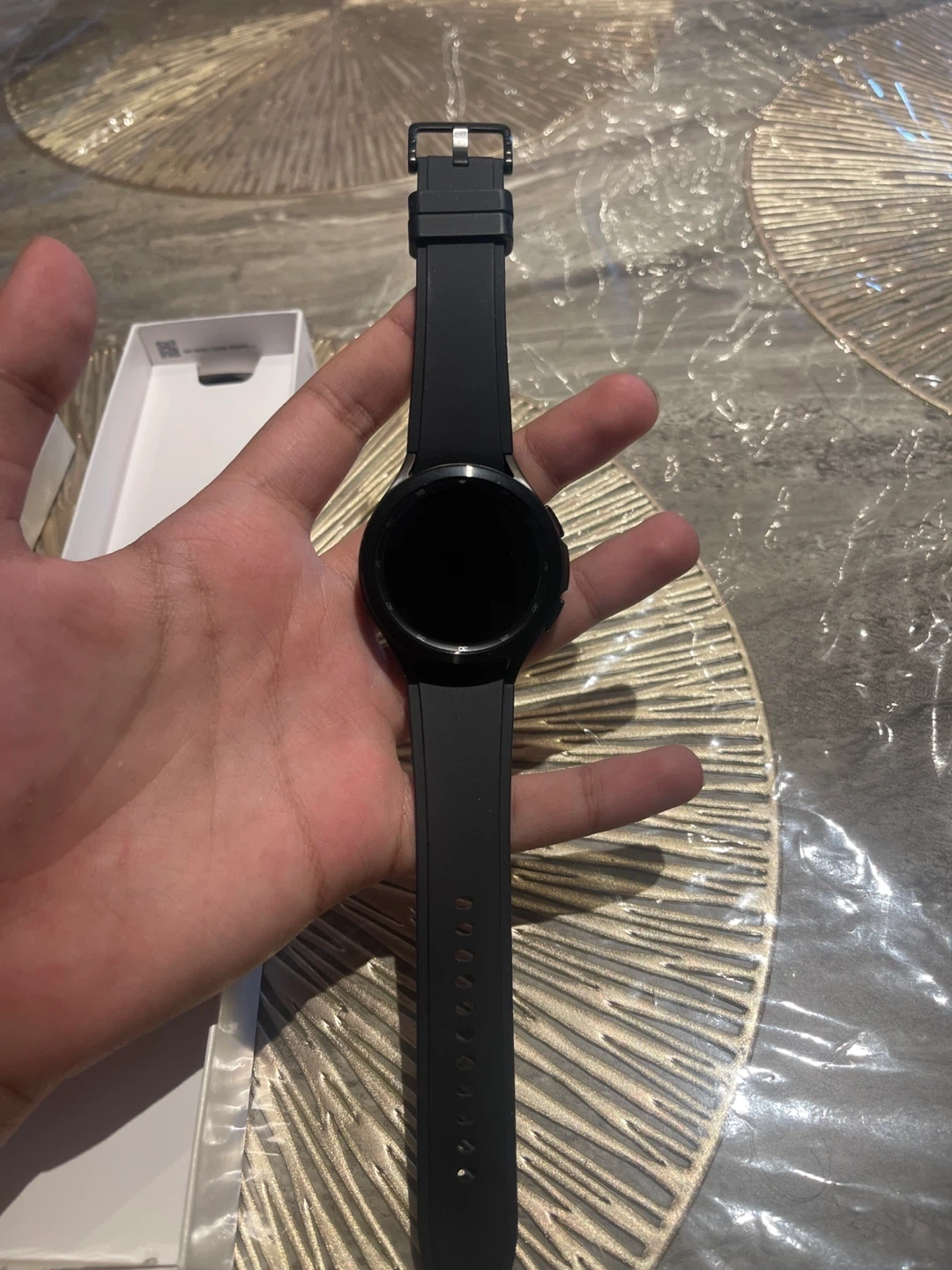 Samsung Galaxy Watch4 Classic smartwatch in black. Includes charging puck and original box. Comes with a black silicone band and an extra grey silicone band.