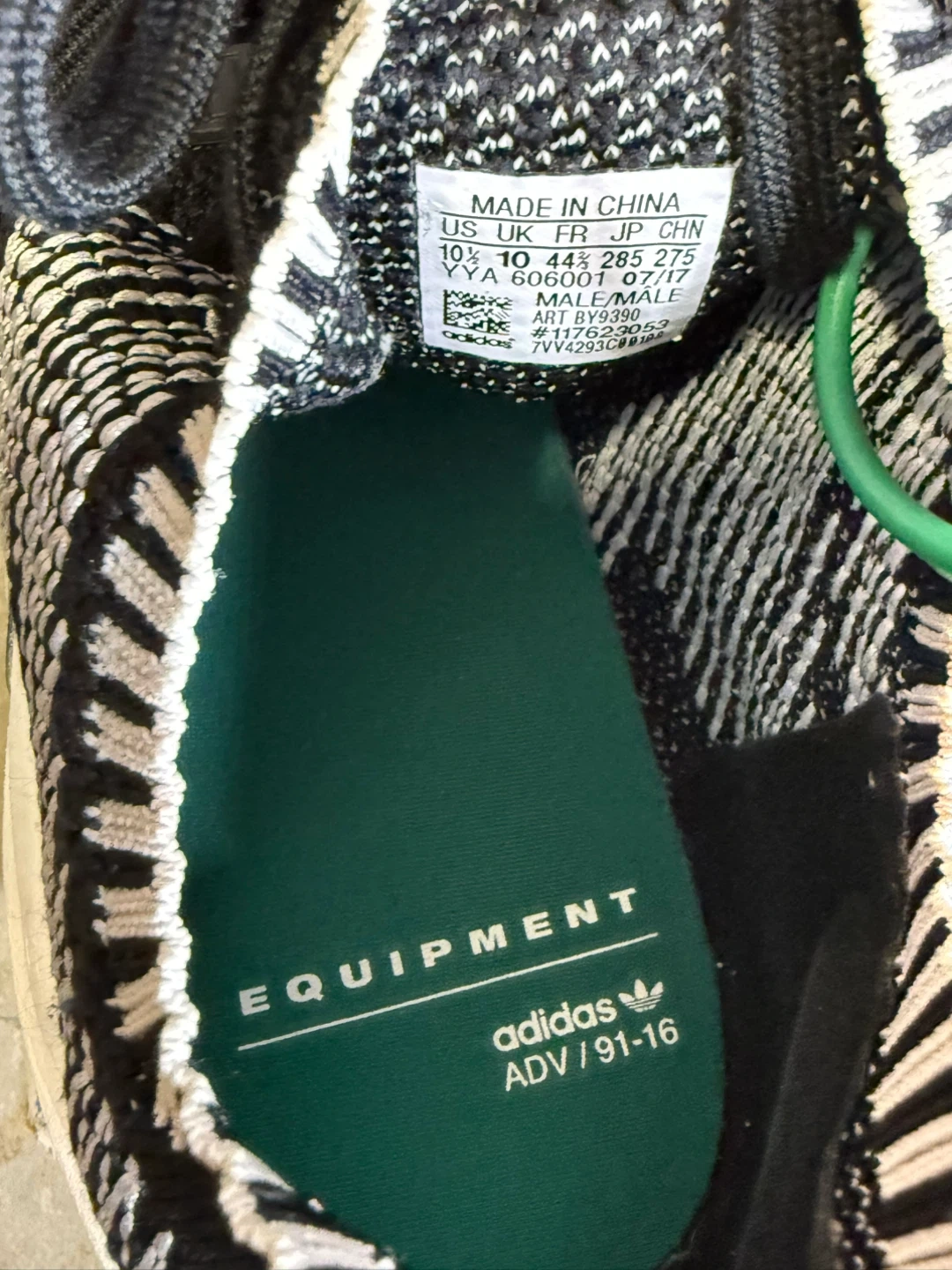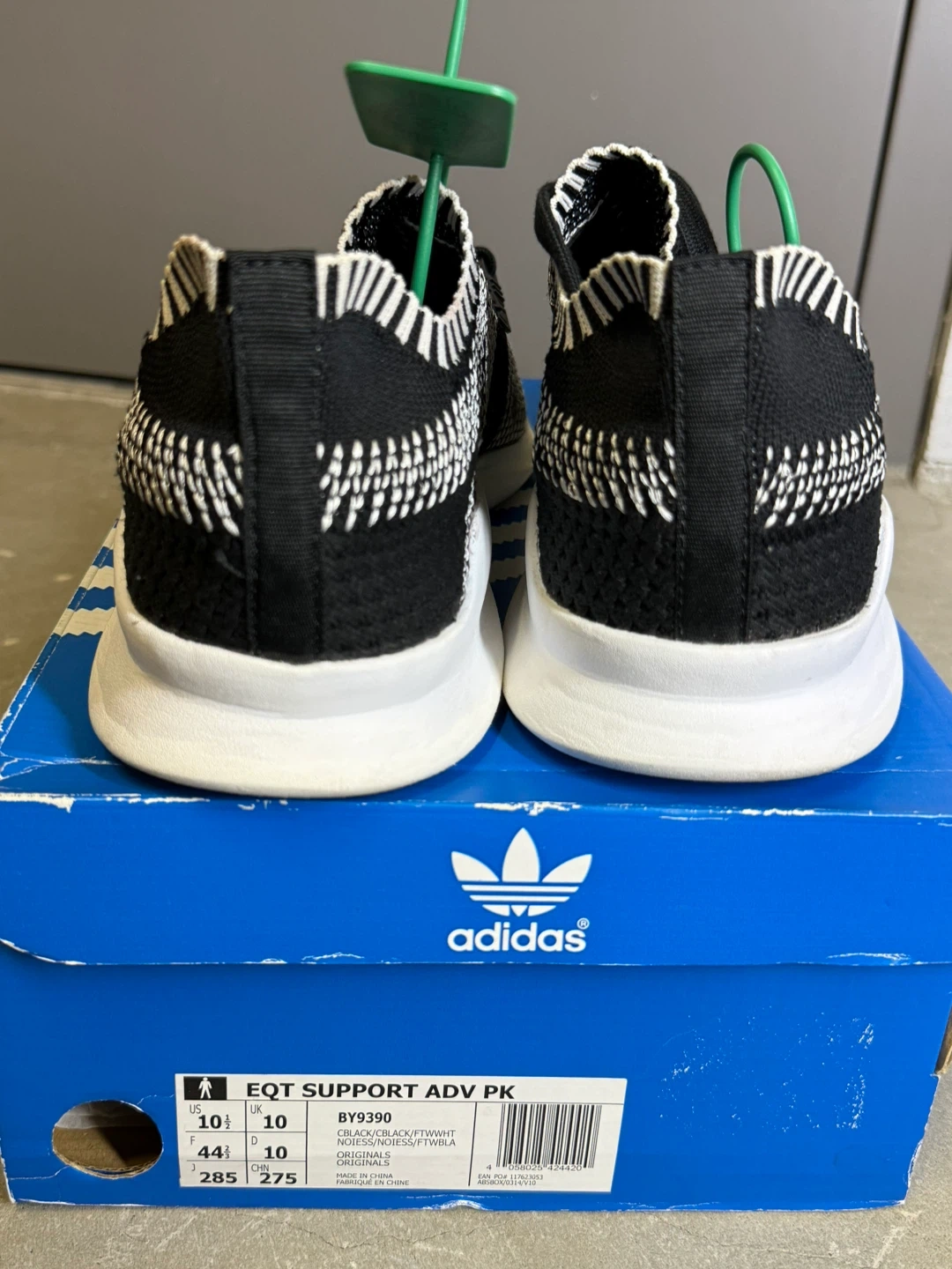 Black and white Adidas EQT Support ADV PK running shoes. Includes original box. Size is US 10.5