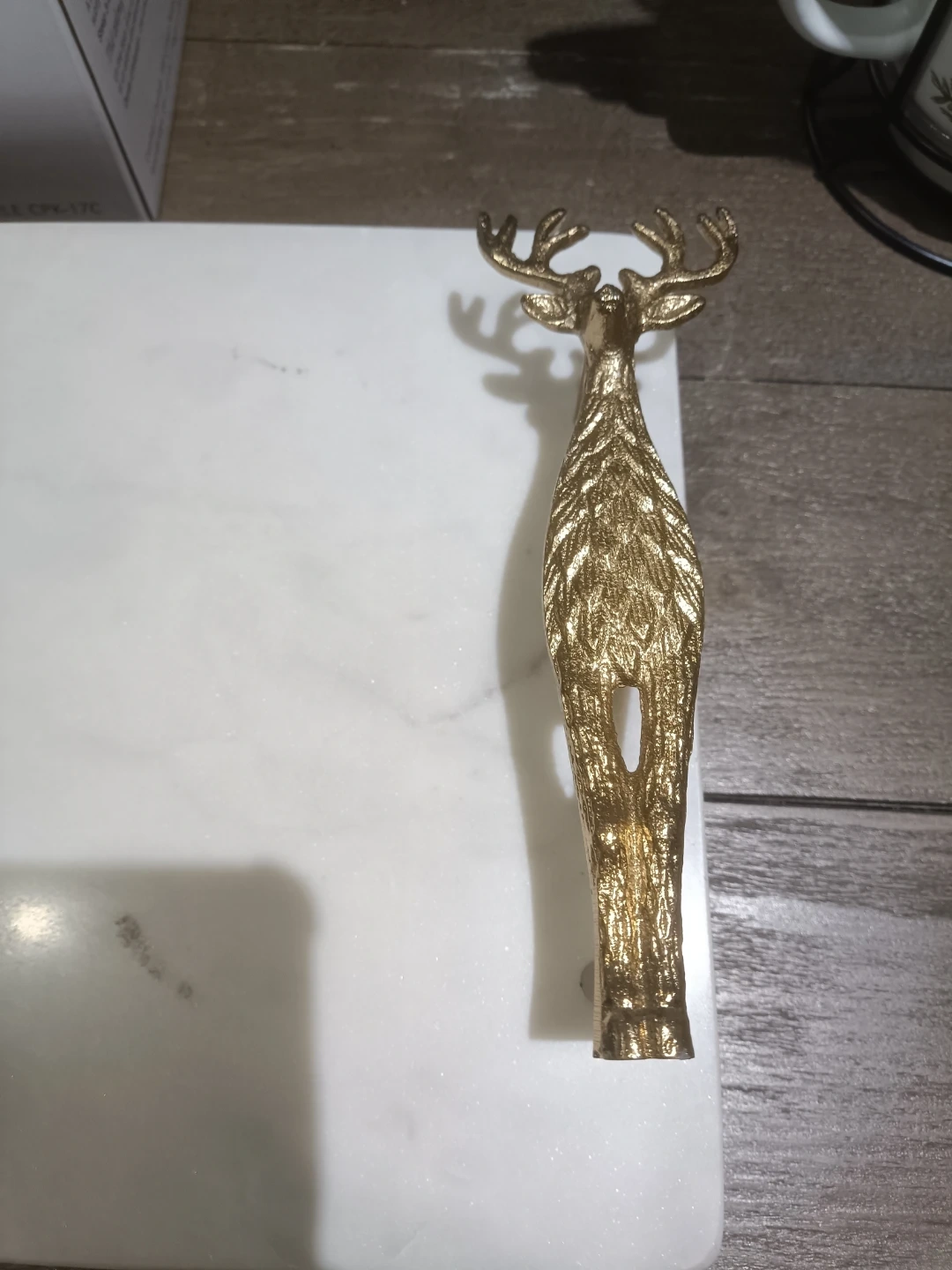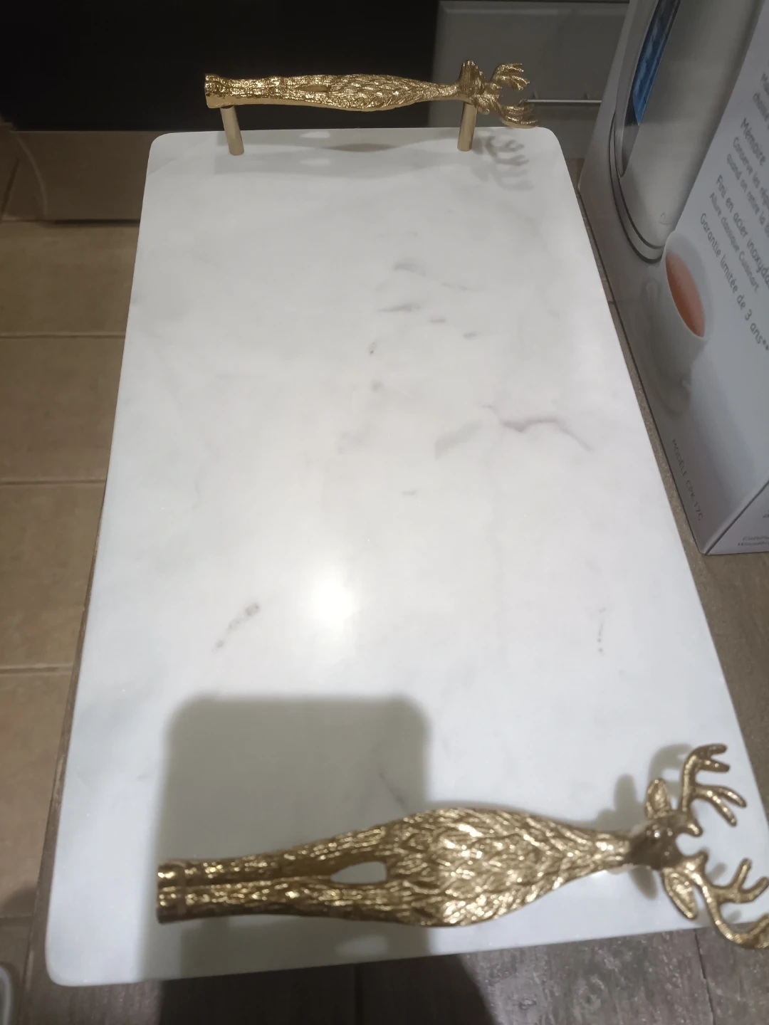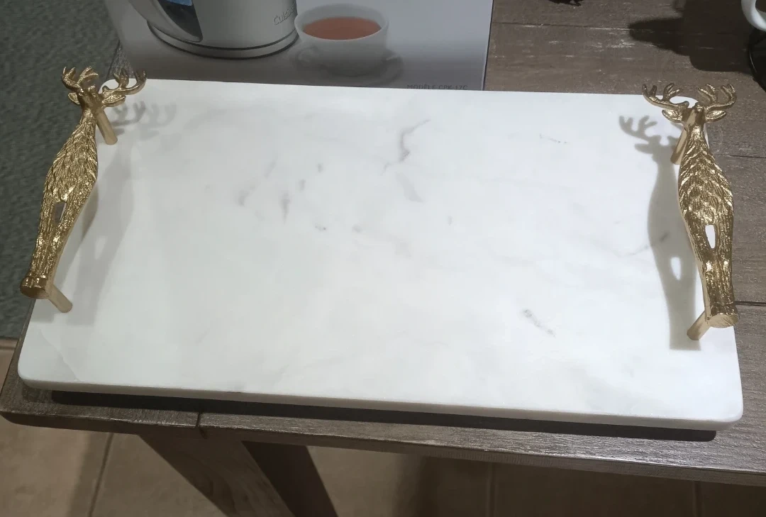 Beautiful white marble tray with decorative golden deer handles. Perfect for serving appetizers or displaying objects. Marble is durable and easy to clean. Ideal for gatherings or as an elegant decorative accent.