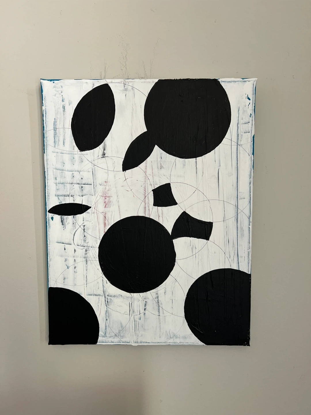 This is an abstract painting featuring black circles on a textured white background with subtle linear elements. It's a canvas piece. The artwork adds a modern touch to any space.