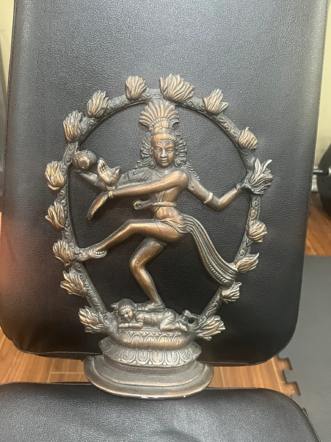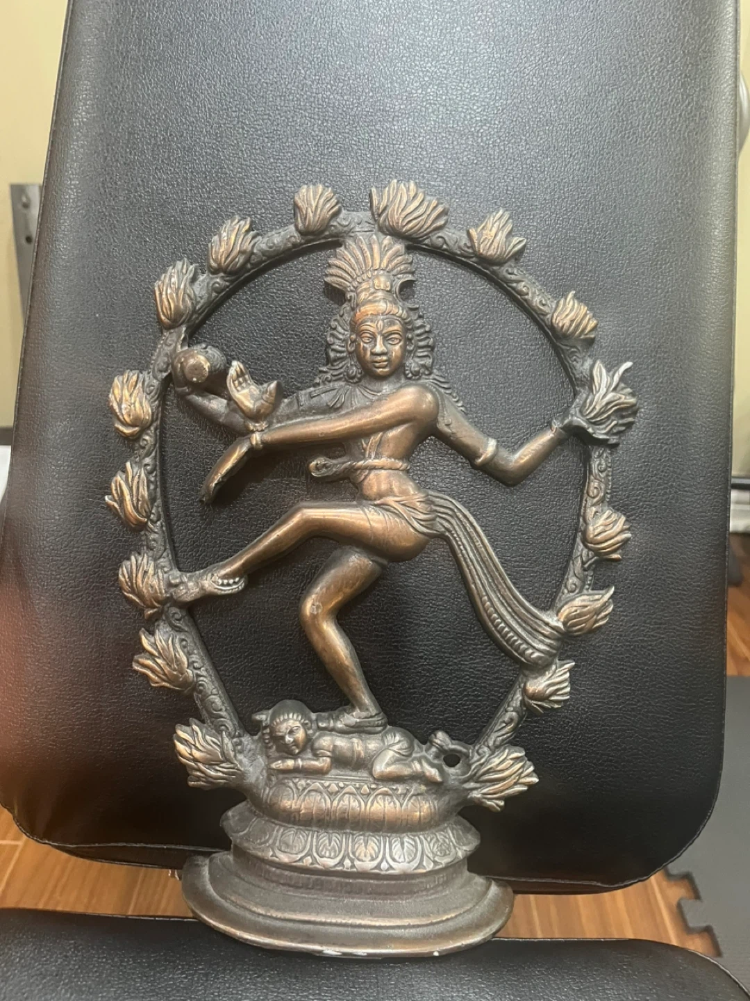 A detailed bronze statue of Shiva as Nataraja, the cosmic dancer. It depicts Shiva in his divine form, surrounded by a circle of flames. The base features a small figure beneath Shiva's feet. Cast metal construction. 11” high