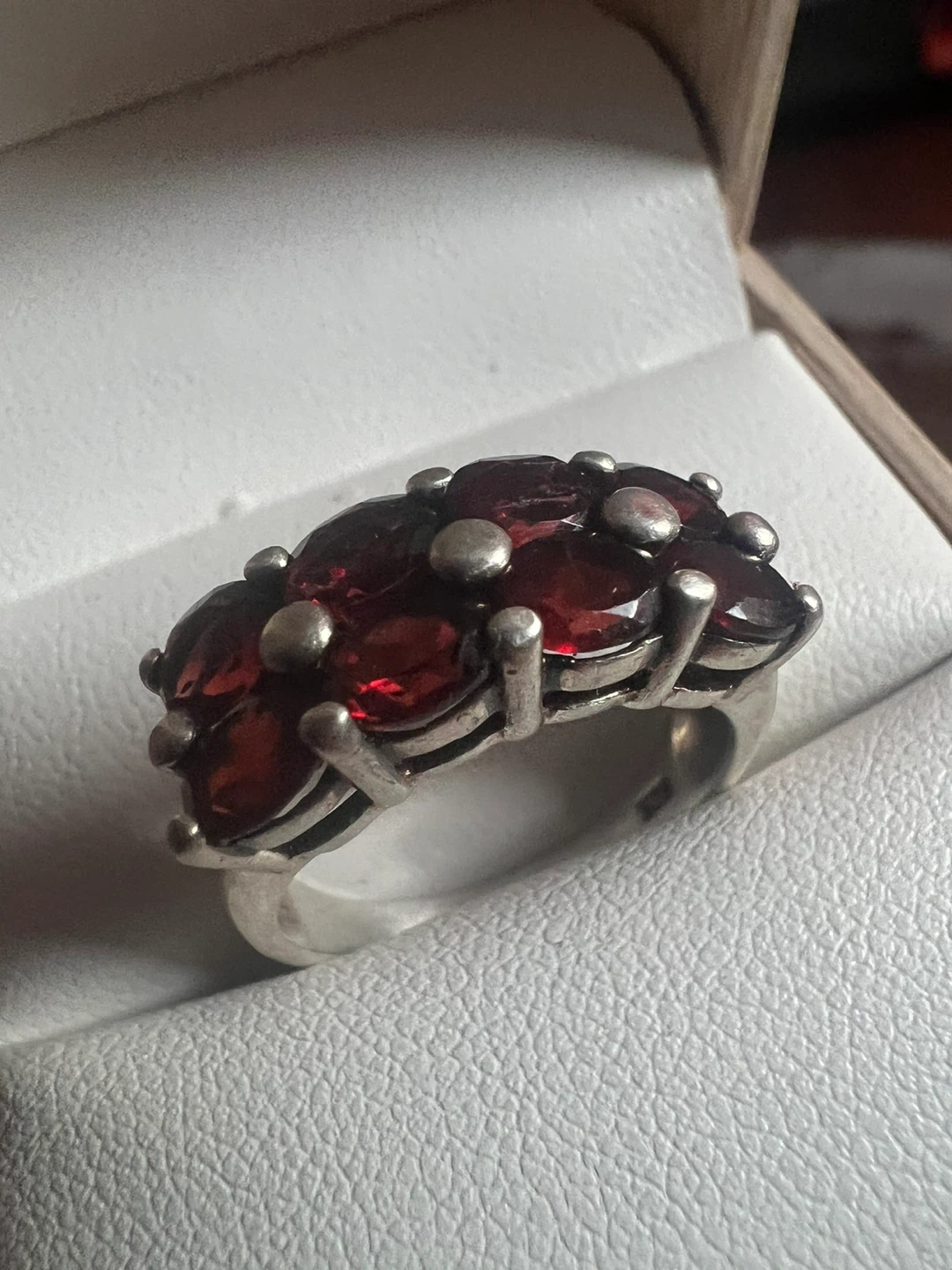 925 silver ring featuring multiple oval-cut garnets. The stones are set in a cluster design with small silver beads accenting the setting. A lovely piece for any jewellery collection!