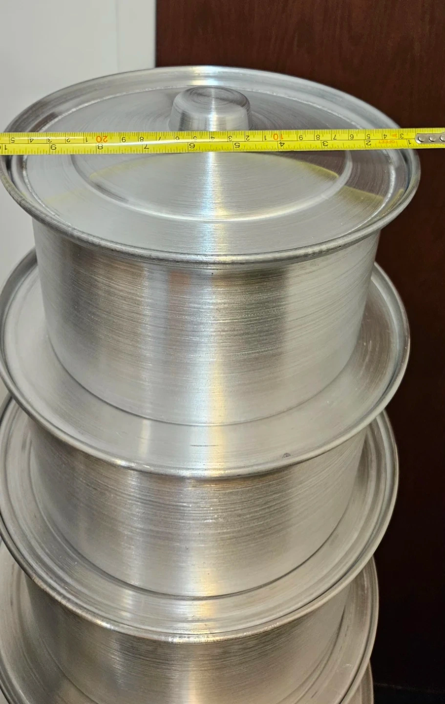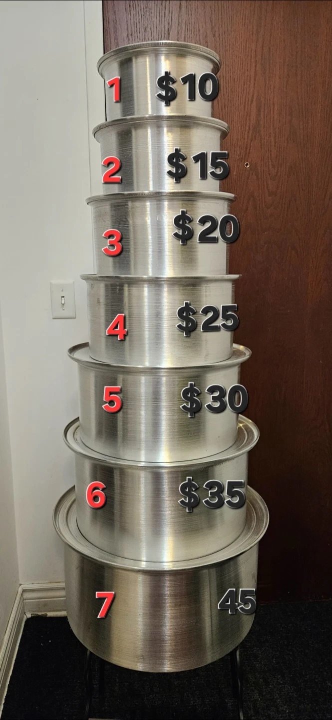 This set includes seven large aluminum stock pots, suitable for big batch cooking. Pots are made of durable aluminum. Available in multiple sizes for various culinary needs.