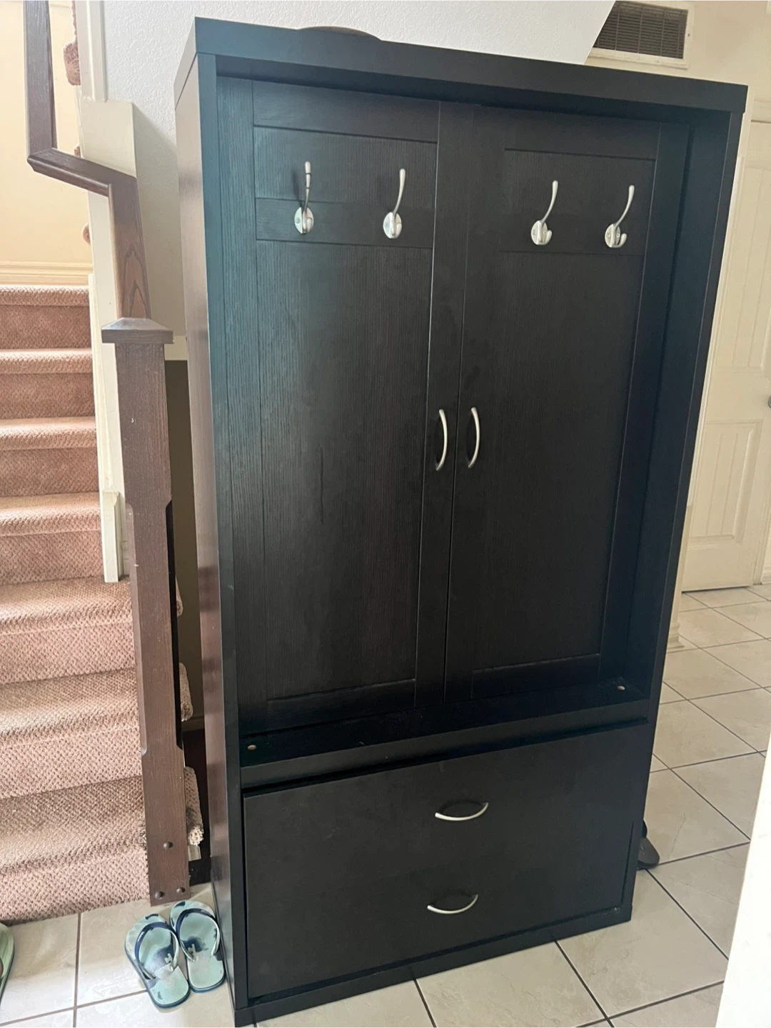 This hall tree offers convenient storage with coat hooks and two drawers. It's made of dark wood-look material. Perfect for entryways to keep things tidy!