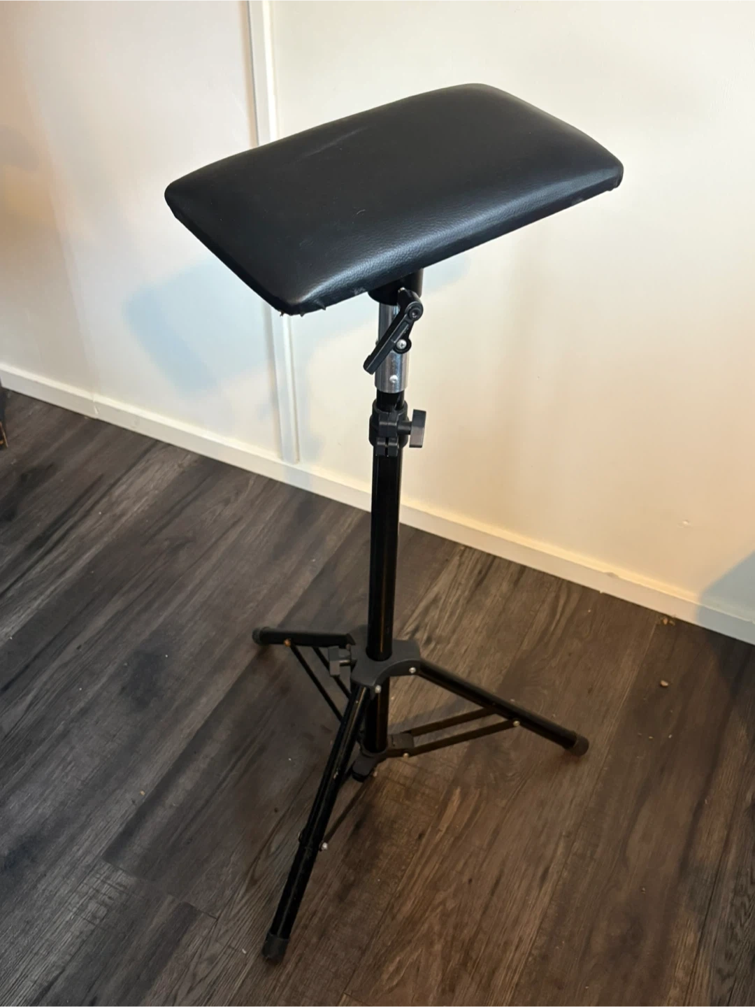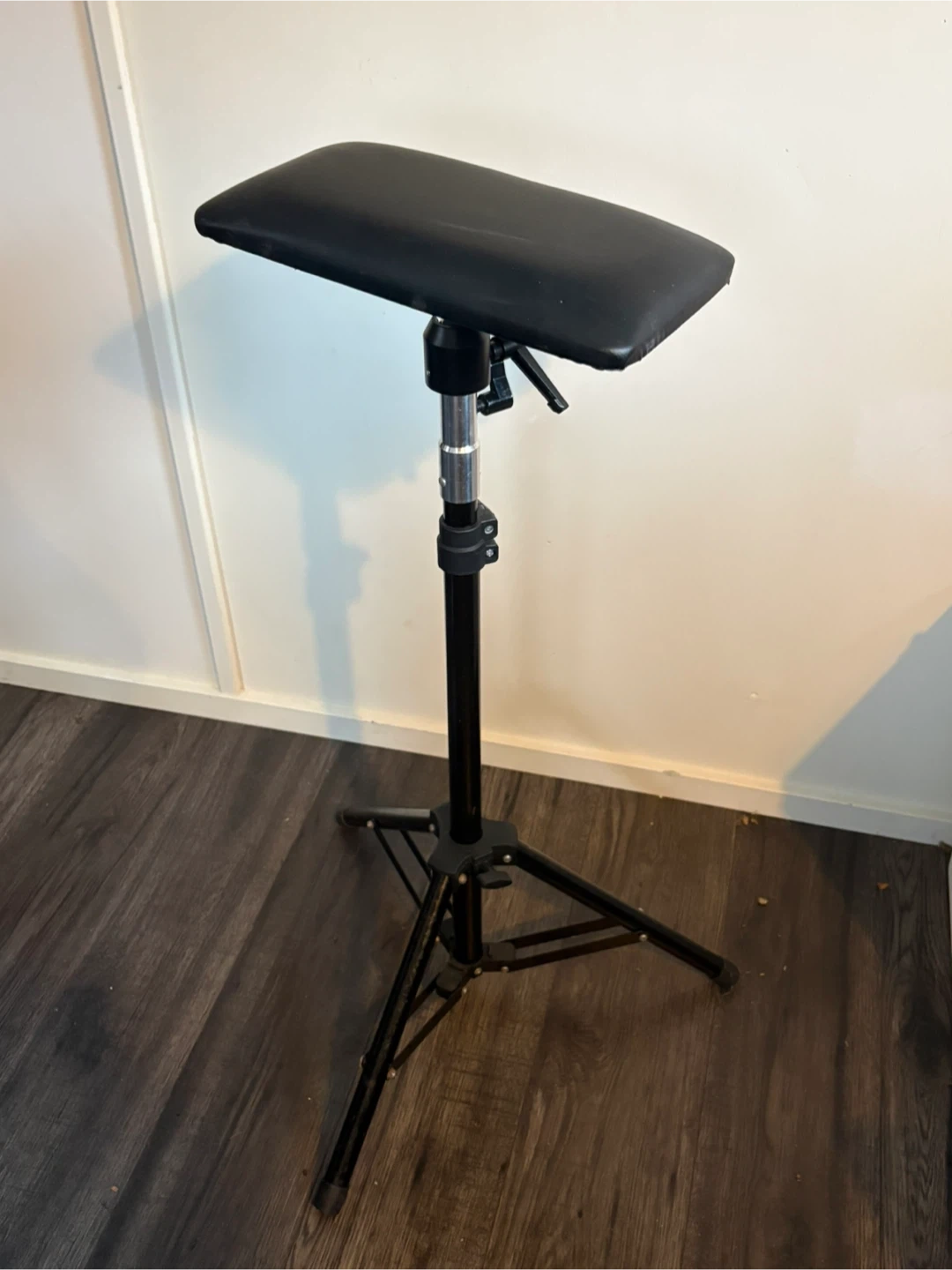 This is an adjustable armrest stand for tattoos. It's made of black faux leather and metal. The height is adjustable for comfort during tattoo sessions.