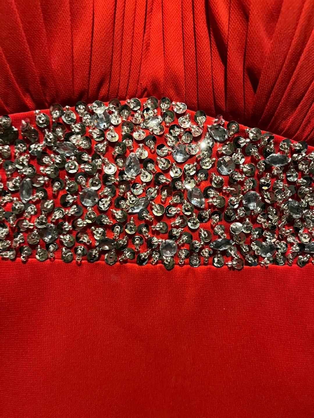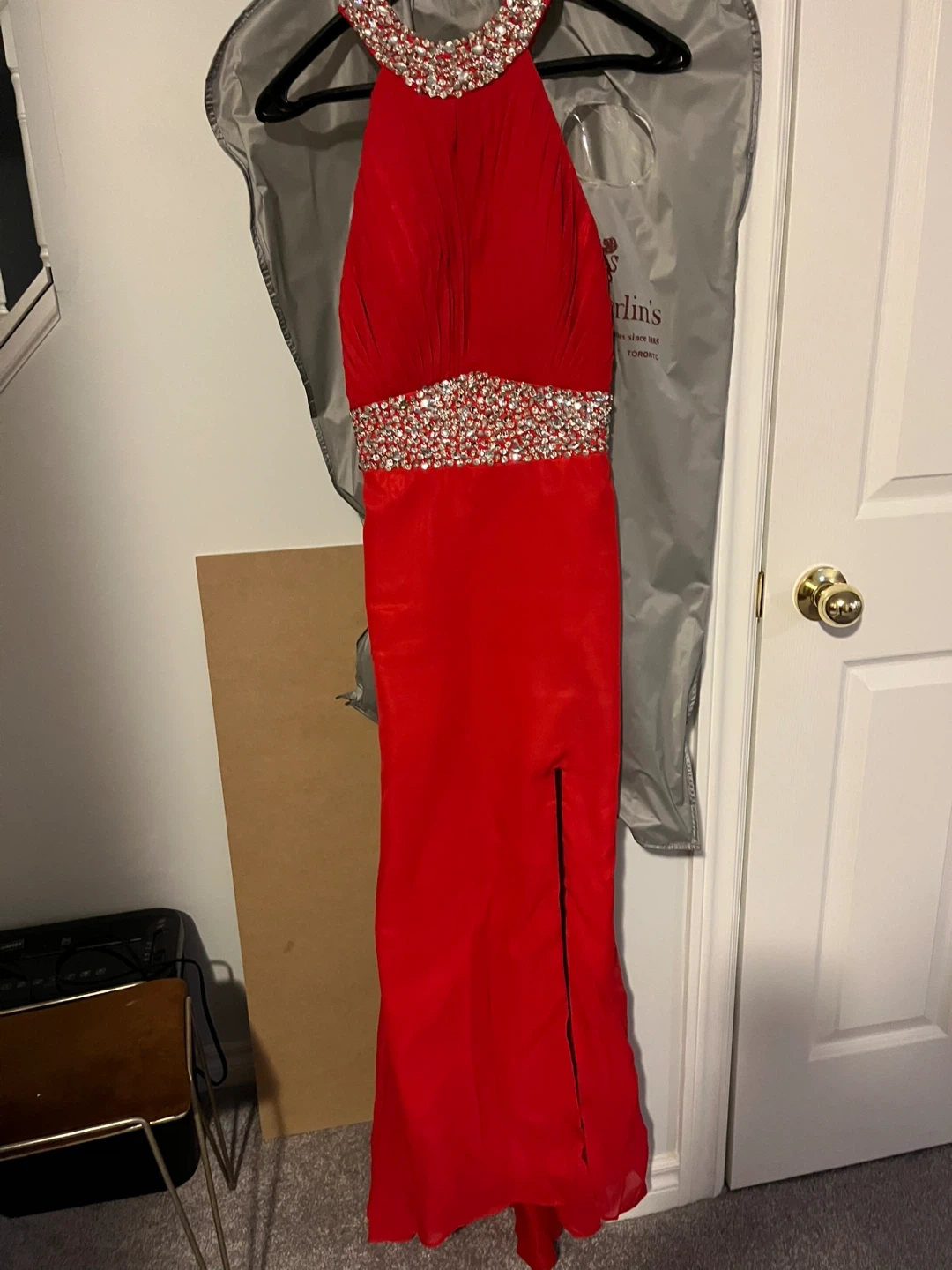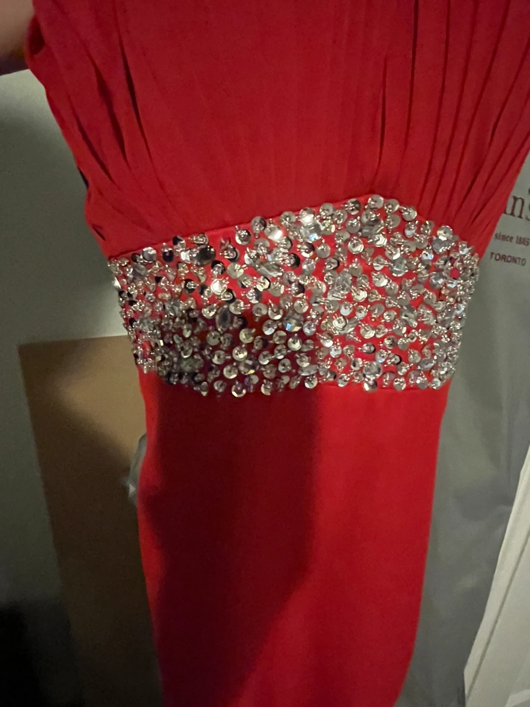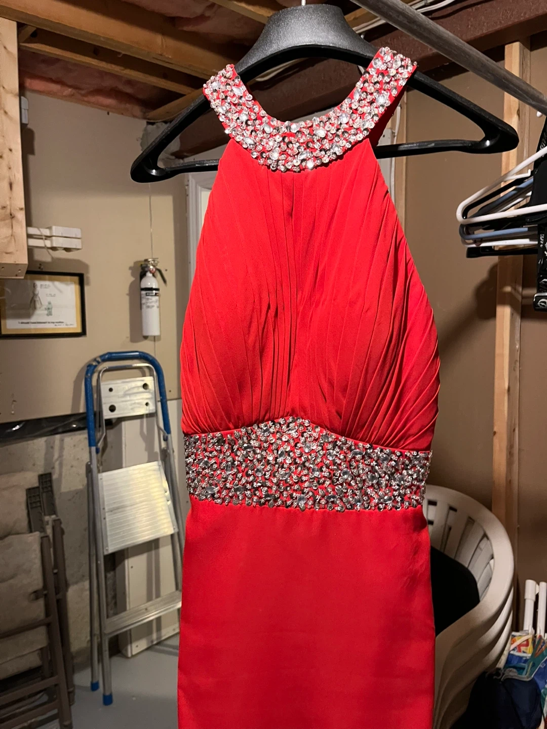 Stunning red formal dress with a halter neckline and dazzling rhinestone embellishments at the collar and waist. Features a flattering ruched bodice and a side slit for elegant movement. Side zip closure.