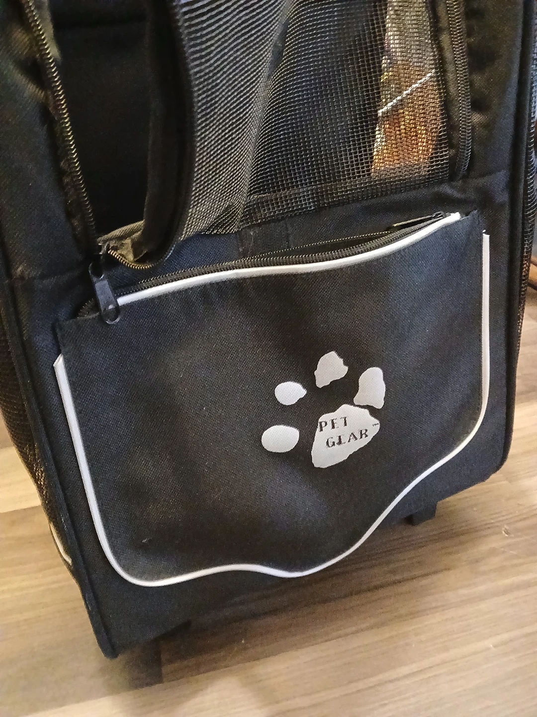 Black rolling pet carrier bag. It has mesh windows for ventilation and a zippered front pocket with a paw print logo. This carrier is labeled "FOR PETS ONLY". Backpack or roll bag