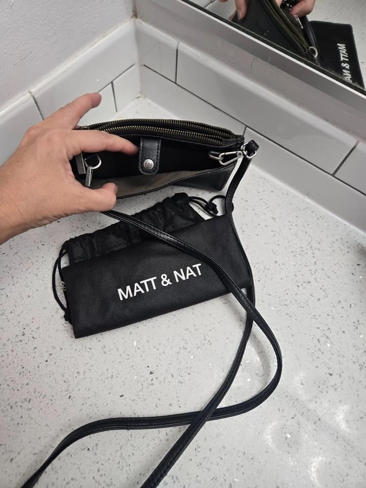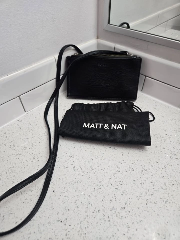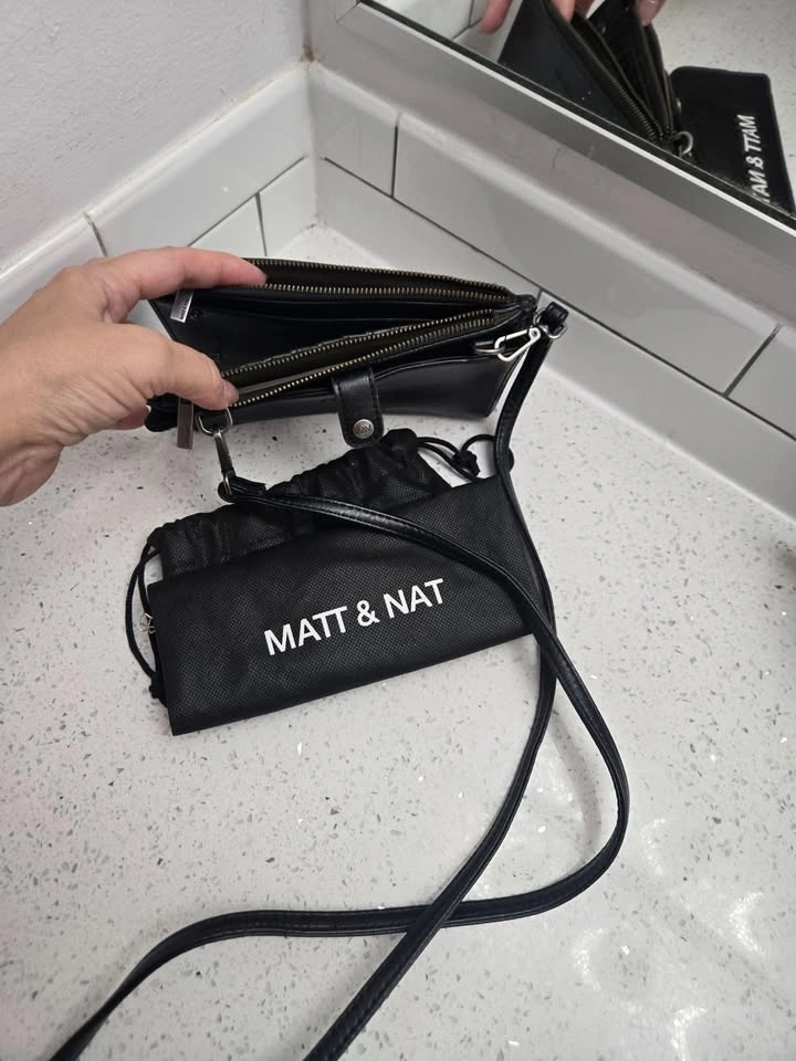 Used about 4 times. Holds a regular-size cell phone. Vegan & Cruelty Free. Comes with dusting bag. Great for going to concerts or events at stadiums.