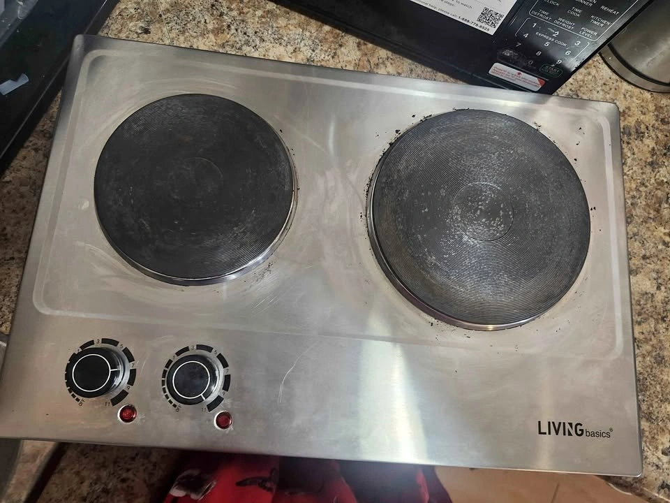 This LIVINGbasics double hot plate has a total power of 1800W (900W per burner). It features stainless steel housing with cast iron heating elements. The dual control knobs allow for adjustable temperature, and it has non-slip rubber feet. It works with all types of cookware, including aluminum, copper, and cast iron. Suitable for small kitchens, offices, or as an extra cooking appliance.