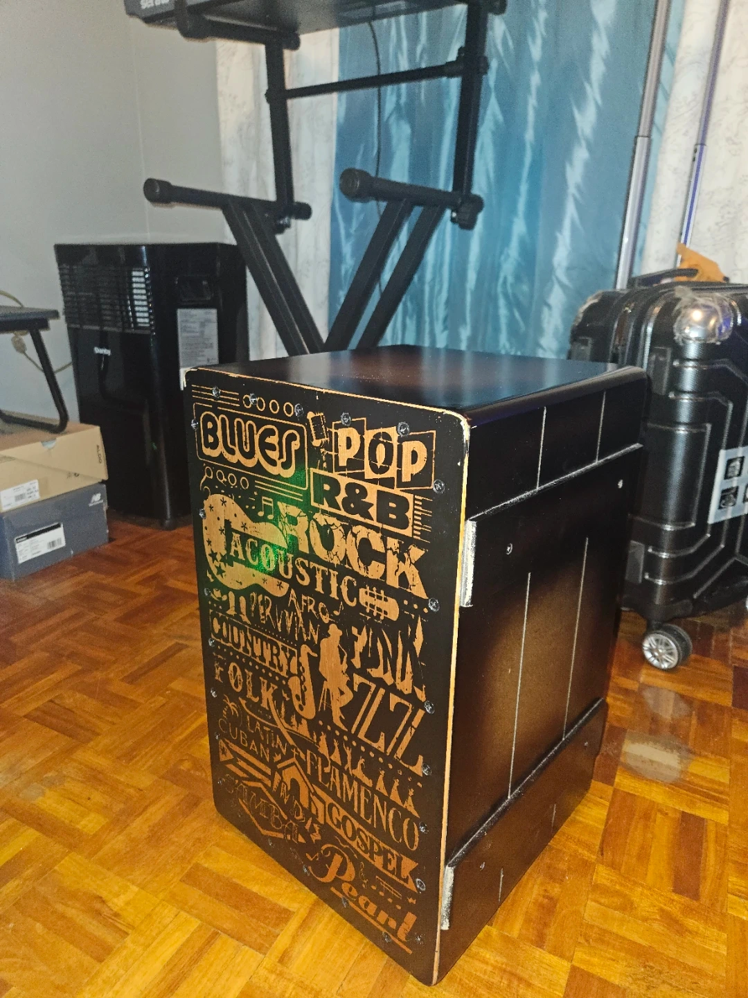 Very good quality wood made Cajon with duel snare strings. I can provide a video so that you can get the performance and hear how it sounds like. Comes with a protective cover.