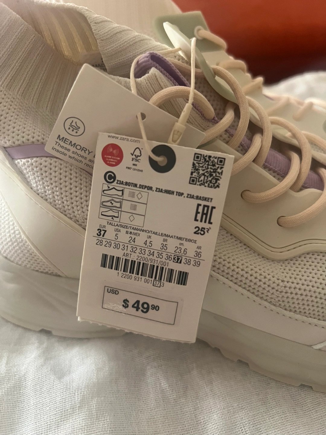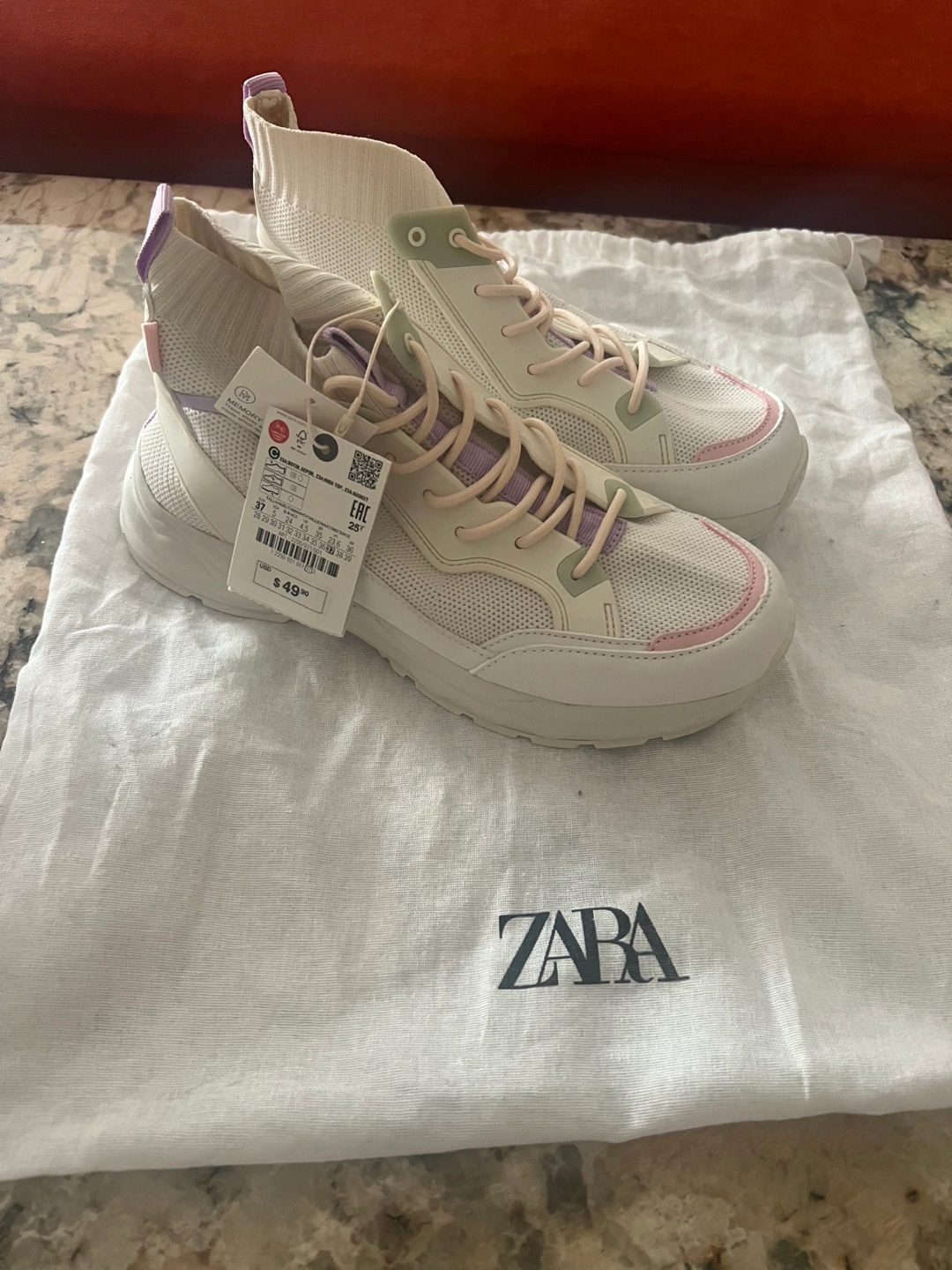These sneakers are brand new, with the original tags still attached. They feature a unique, modern design. The shoes have a sock-like ankle. Perfect for a relaxing stroll in the park. ZARA, EU 37, US 7. For girls or woman. Pick up Sheepshead Bay.
