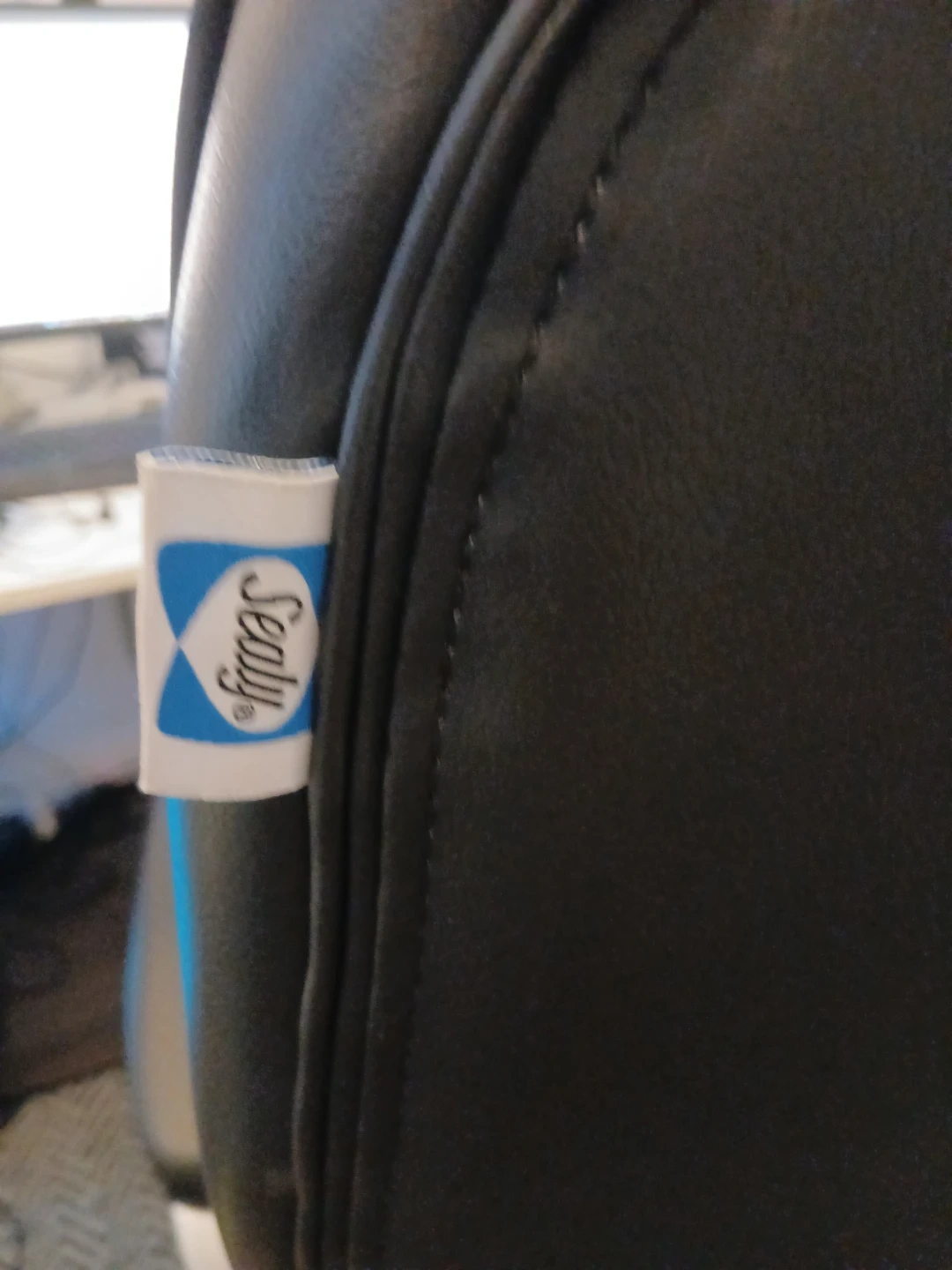 This is a black executive office chair from Sealy. It features a padded seat and backrest with ergonomic armrests. The chair has a five-star base with casters for easy mobility. Some wear is visible on the seat seam.