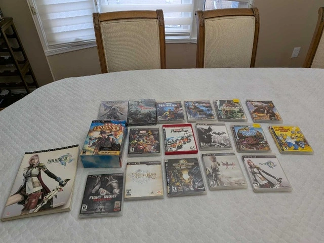 Selling a lot of 15 PS3 games with a few extras. Includes: The Simpsons Game (rare, great condition), Final Fantasy XIII (great condition), Final Fantasy XIII-2 (scuffed but plays fine, no manual), BioShock Infinite Premium Edition (missing digital soundtrack), Dead Rising 2, Uncharted 1, 2, and 3, Marvel Vs Capcom 3, Burnout Paradise, Batman Arkham City, Little Big Planet, Ni No Kuni, Mortal Kombat vs DC Universe, Fight Night Champions (no manual), Assassin's Creed Steelbook (sealed, case only), Dead Island Riptide Steelbook (sealed, case only), and the Final Fantasy XIII Official Guide. All games are in good condition with manuals, unless noted otherwise. Selling as a lot only. Can meet in the Thornhill area near Bathurst and Clark, or Bathurst and Steeles.