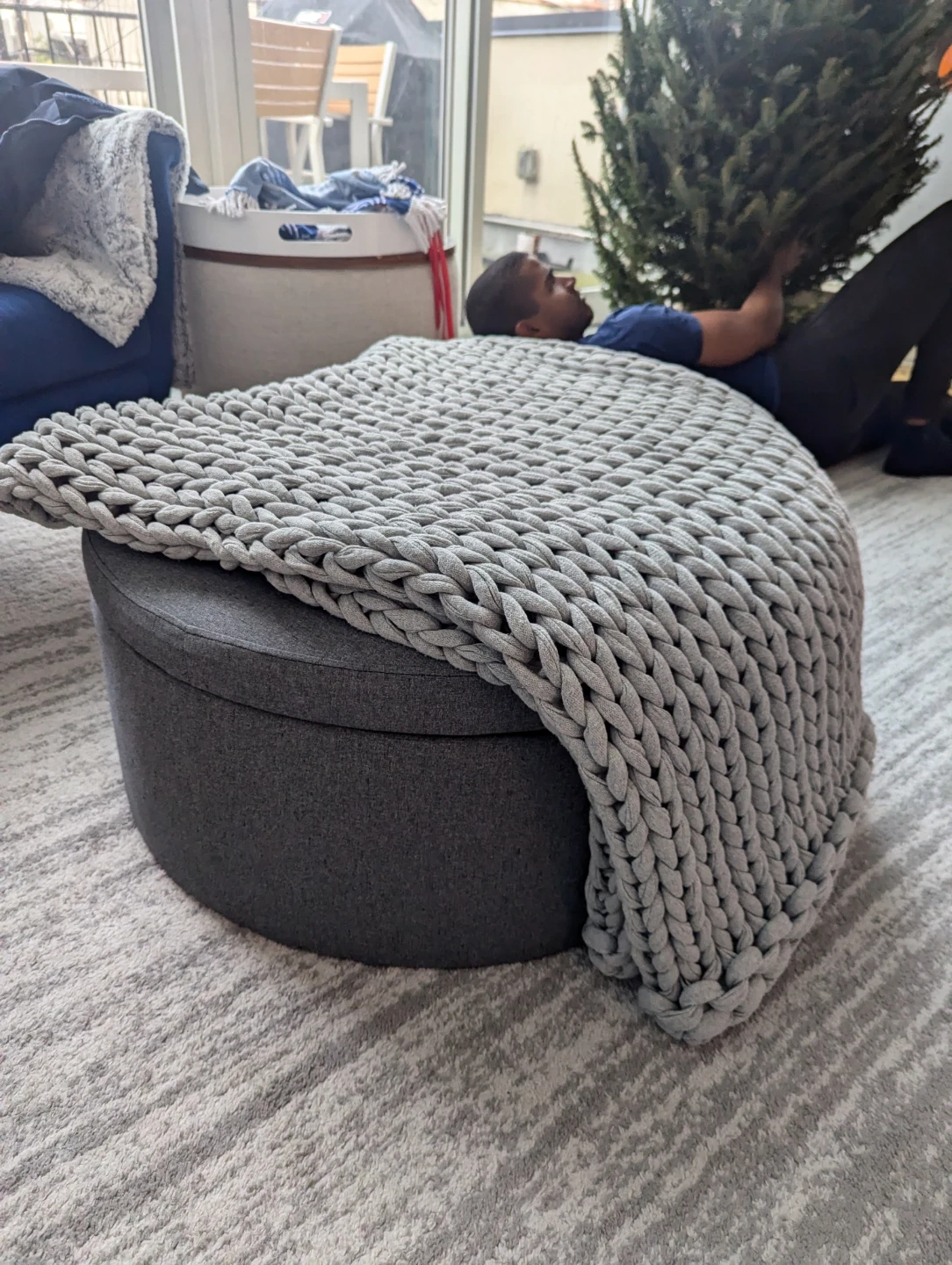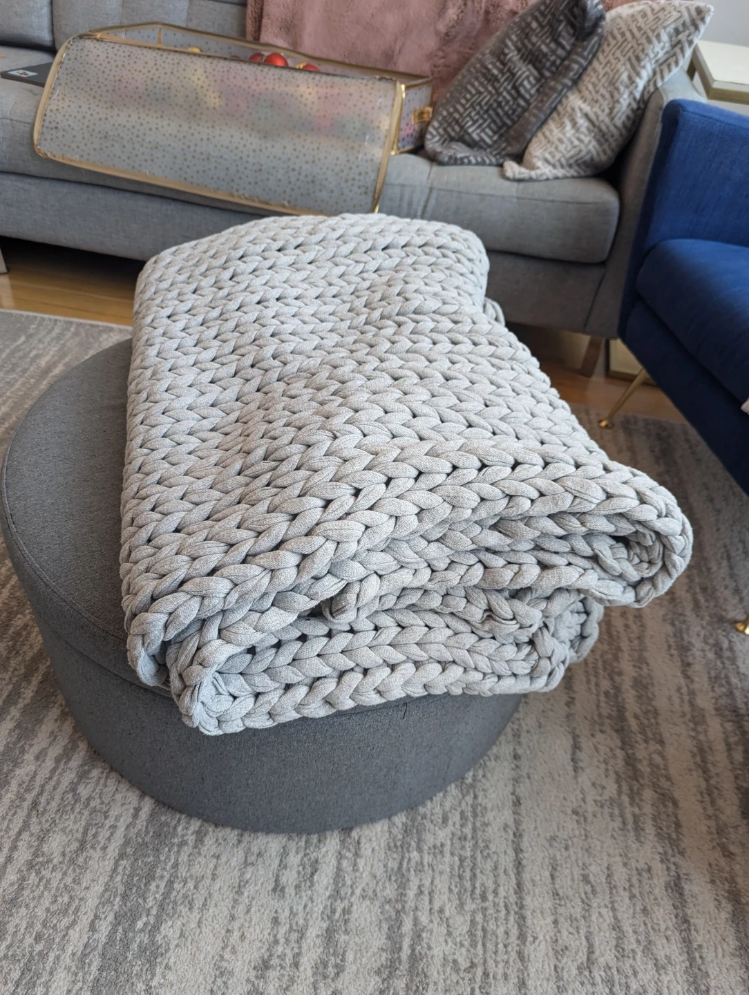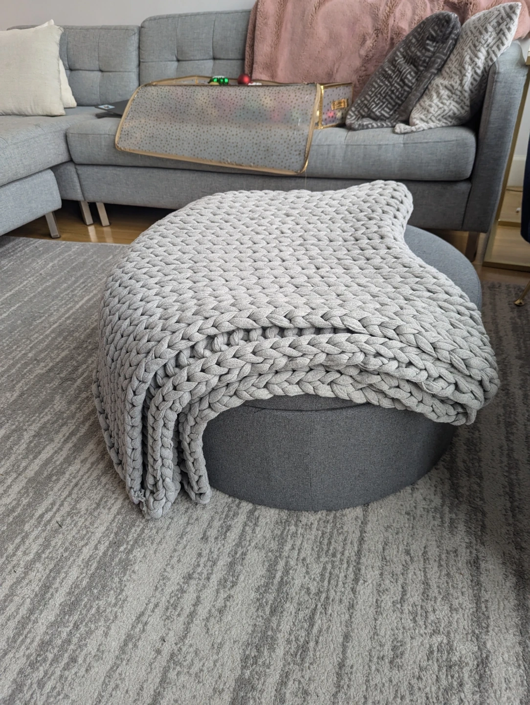 Selling a cozy chunky knit blanket in a lovely gray color. It's perfect for adding texture and warmth to any room. This blanket is in great condition and ready to be enjoyed!