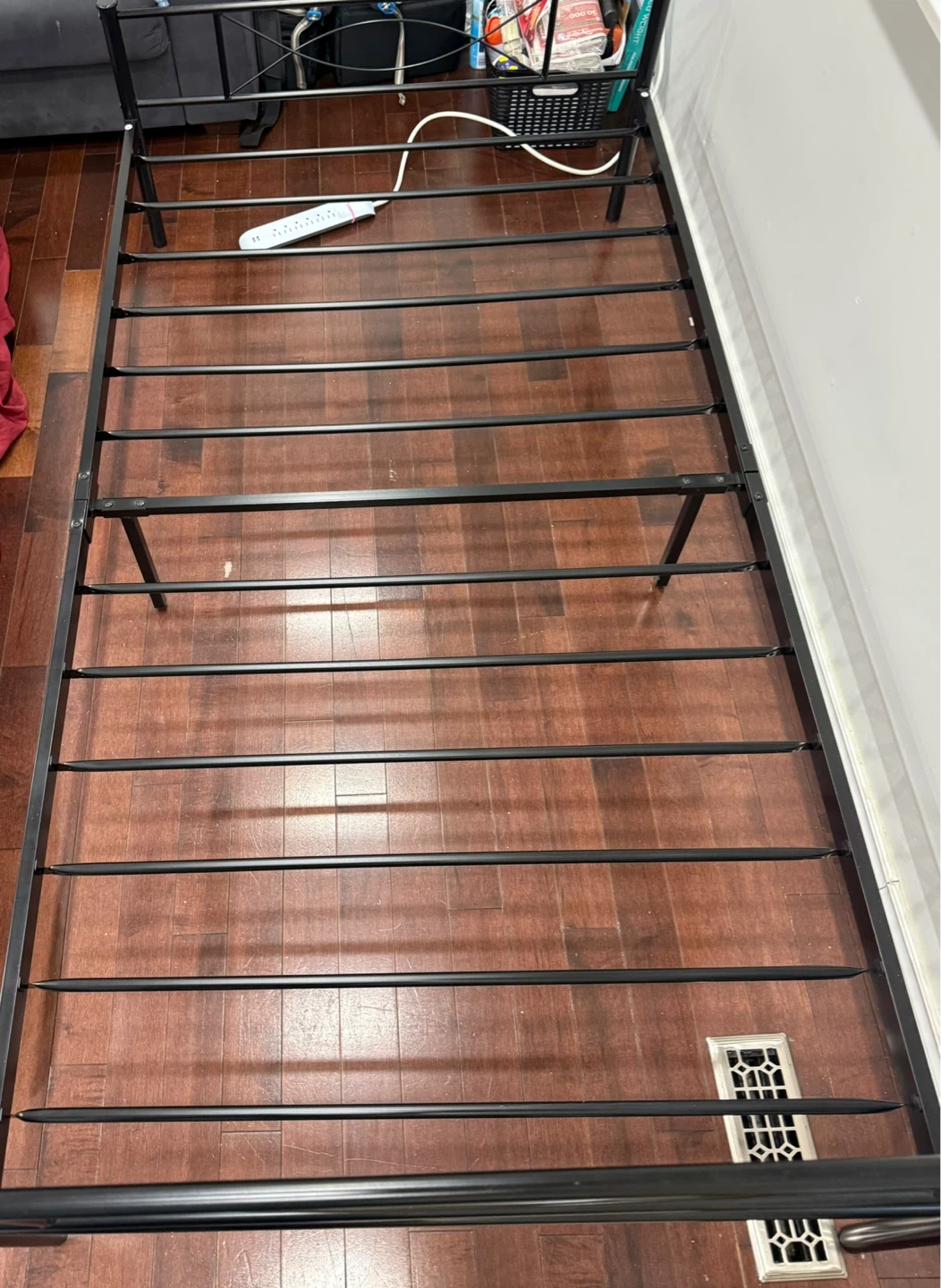 This is a black metal bed frame. It's designed for a twin-sized mattress. The frame's sturdy construction provides reliable support.