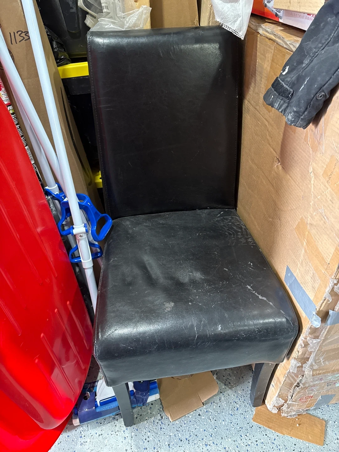 This is a black faux leather dining chair. The material appears to be vinyl or a similar synthetic leather. It has a simple, sturdy design suitable for everyday use. It's a great chair for a kitchen or dining room.