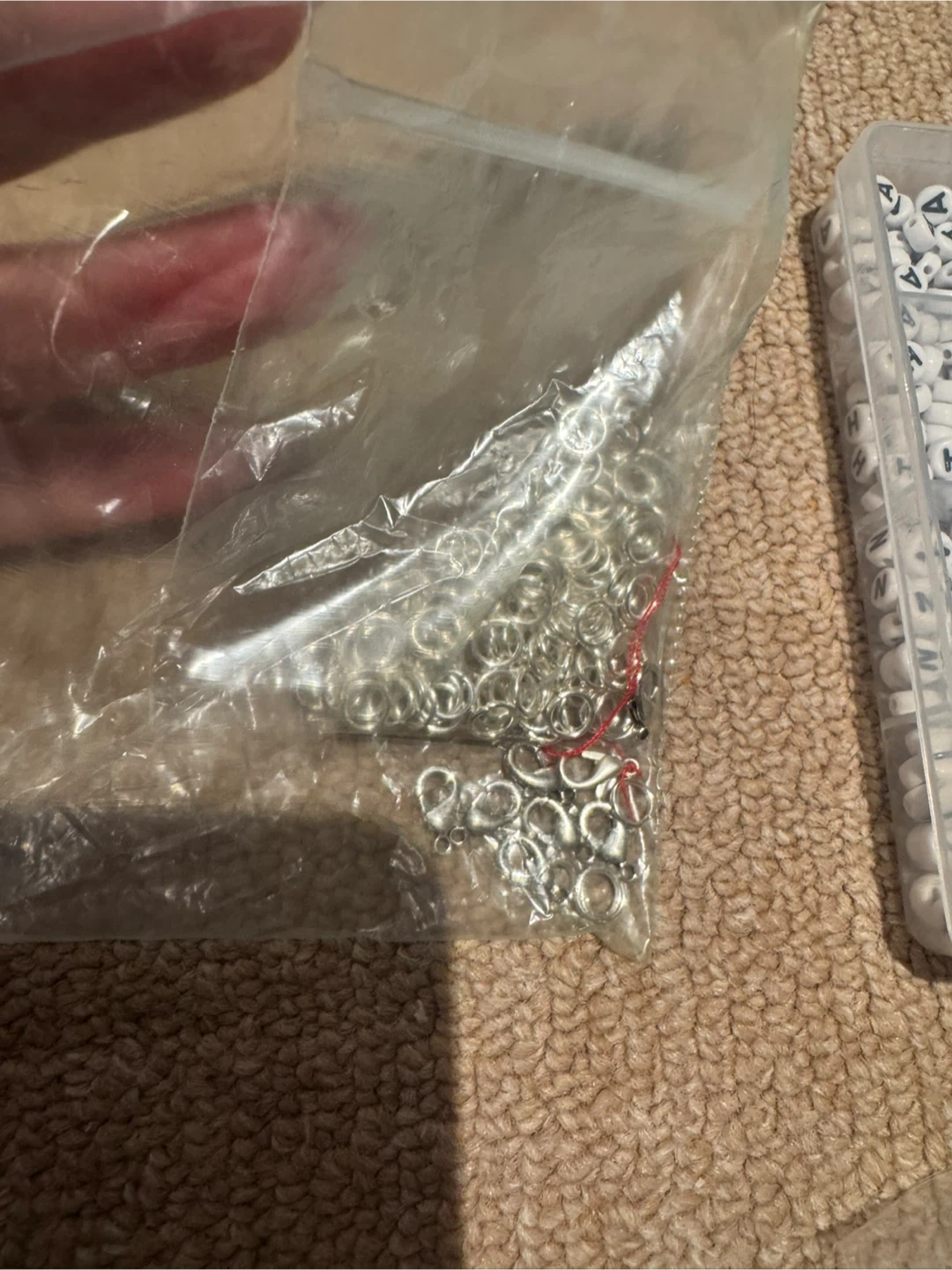 This is a craft kit for making bracelets and jewelry. It includes letter beads, colourful pony beads, elastic cord, jump rings, and needles. Great for DIY projects!