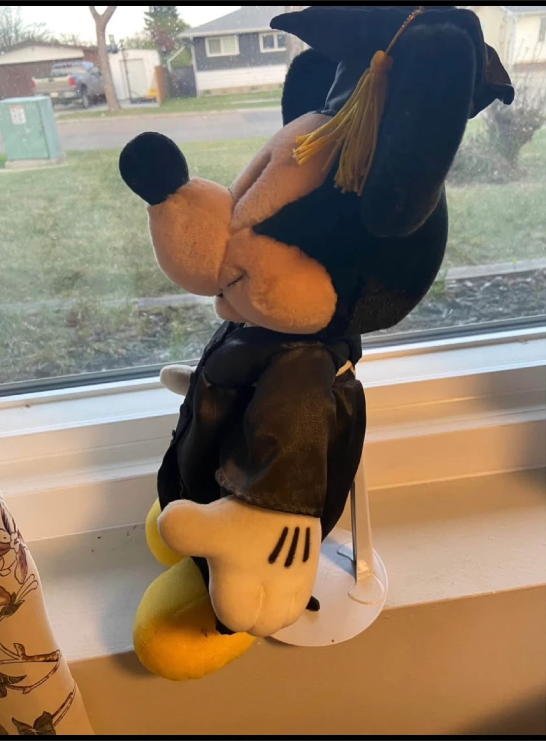 Here's a Mickey Mouse plush dressed in a graduation gown and cap! It's in great condition and would be perfect for a graduation gift or a Disney collector