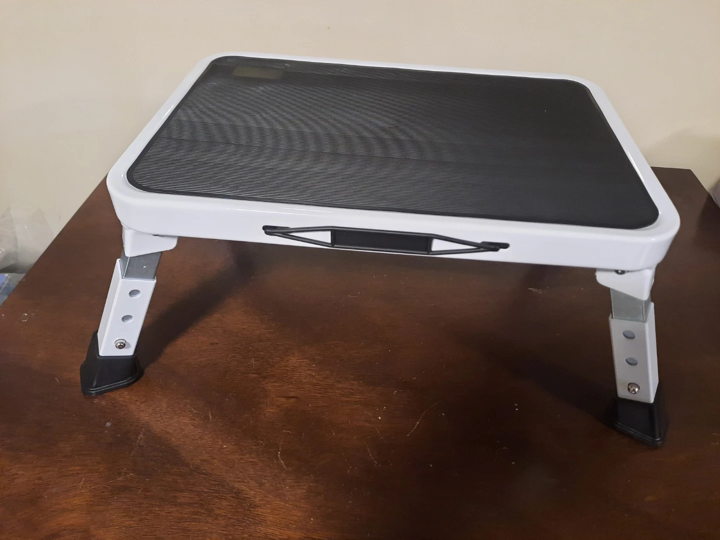 This is a white and black adjustable step stool. Its legs are metal and have adjustable height settings. It's sturdy and can be used for various purposes around the house. This stool is great for reaching higher shelves or as a small step up.
