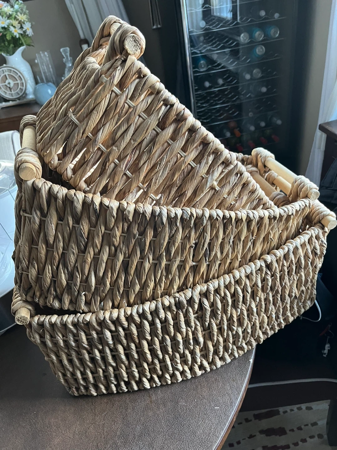 Set of three woven baskets with wooden handles. Perfect for organizing shelves or storing household items. Made from natural woven material.