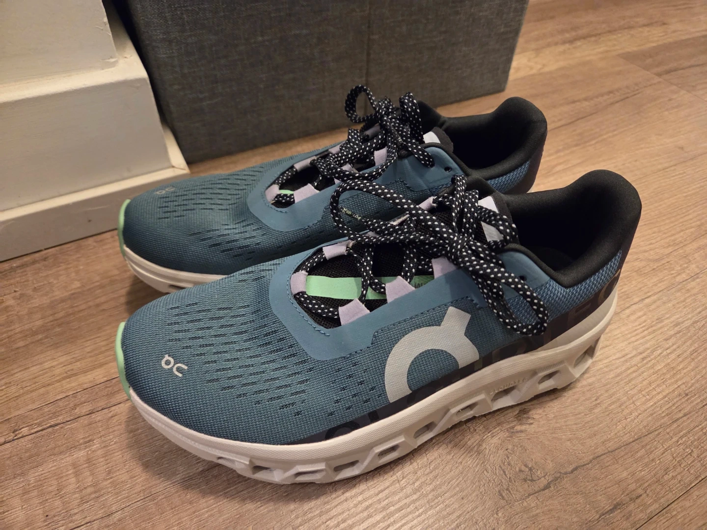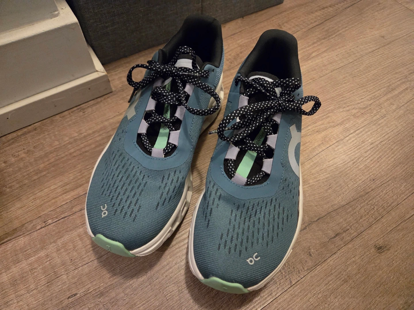 These On Cloudswift running shoes are designed for urban running. They feature a lightweight, breathable upper and a responsive cushioning system. The colour is a mix of blue and mint.