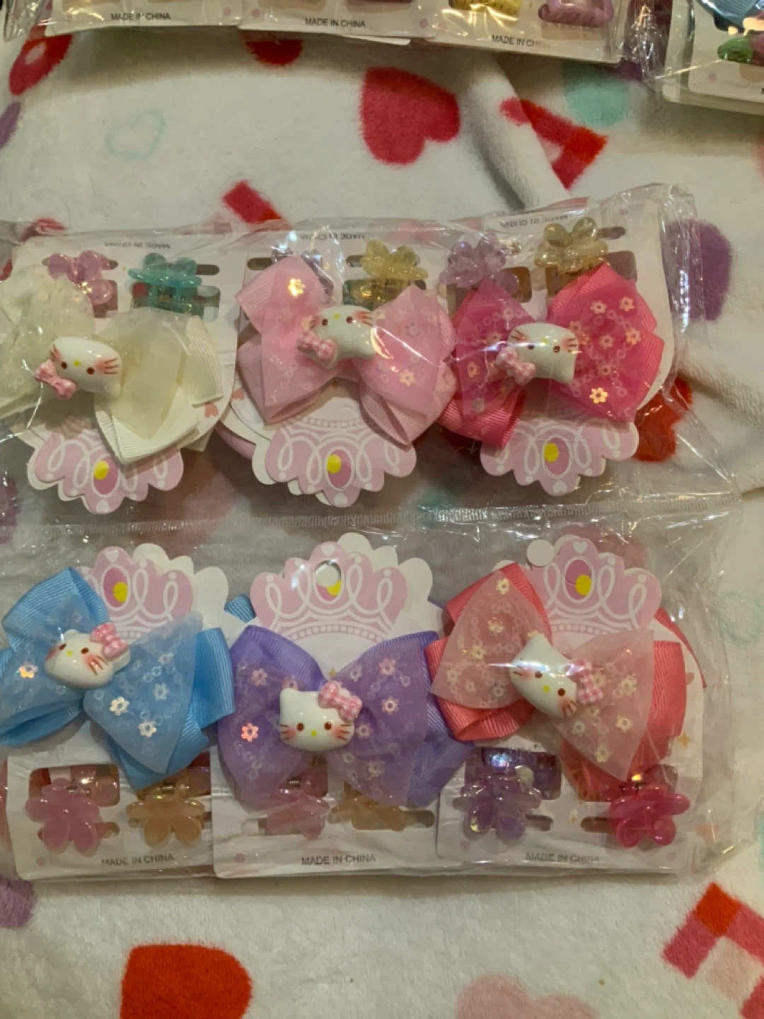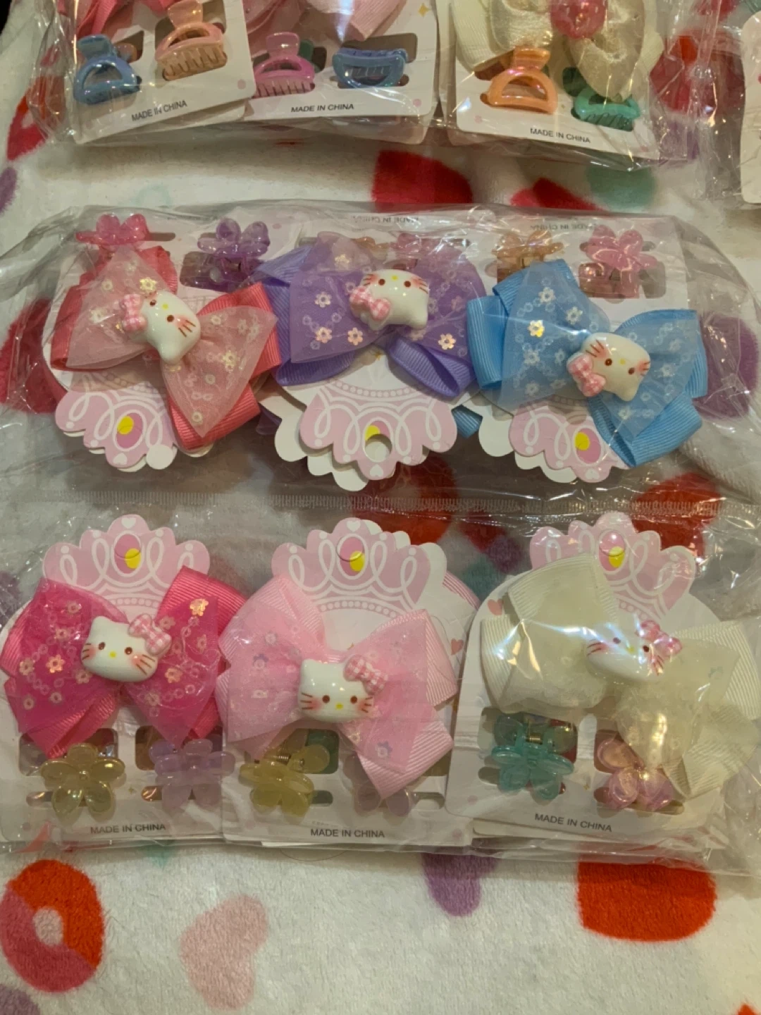 Bow and hair clips with colorful bows and decorative charms. Features include various pastel colors like pink, purple, and blue. Each clip is a small claw style, perfect for securing hair. They're great for kids' hairstyles! For $2 each piece
