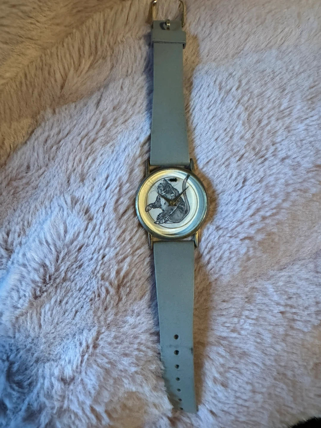 This is a charming vintage watch featuring a detailed sketch of a tabby cat on the face. It has a light grey, durable strap and a classic metal casing. It's a fun accessory for any cat lover!