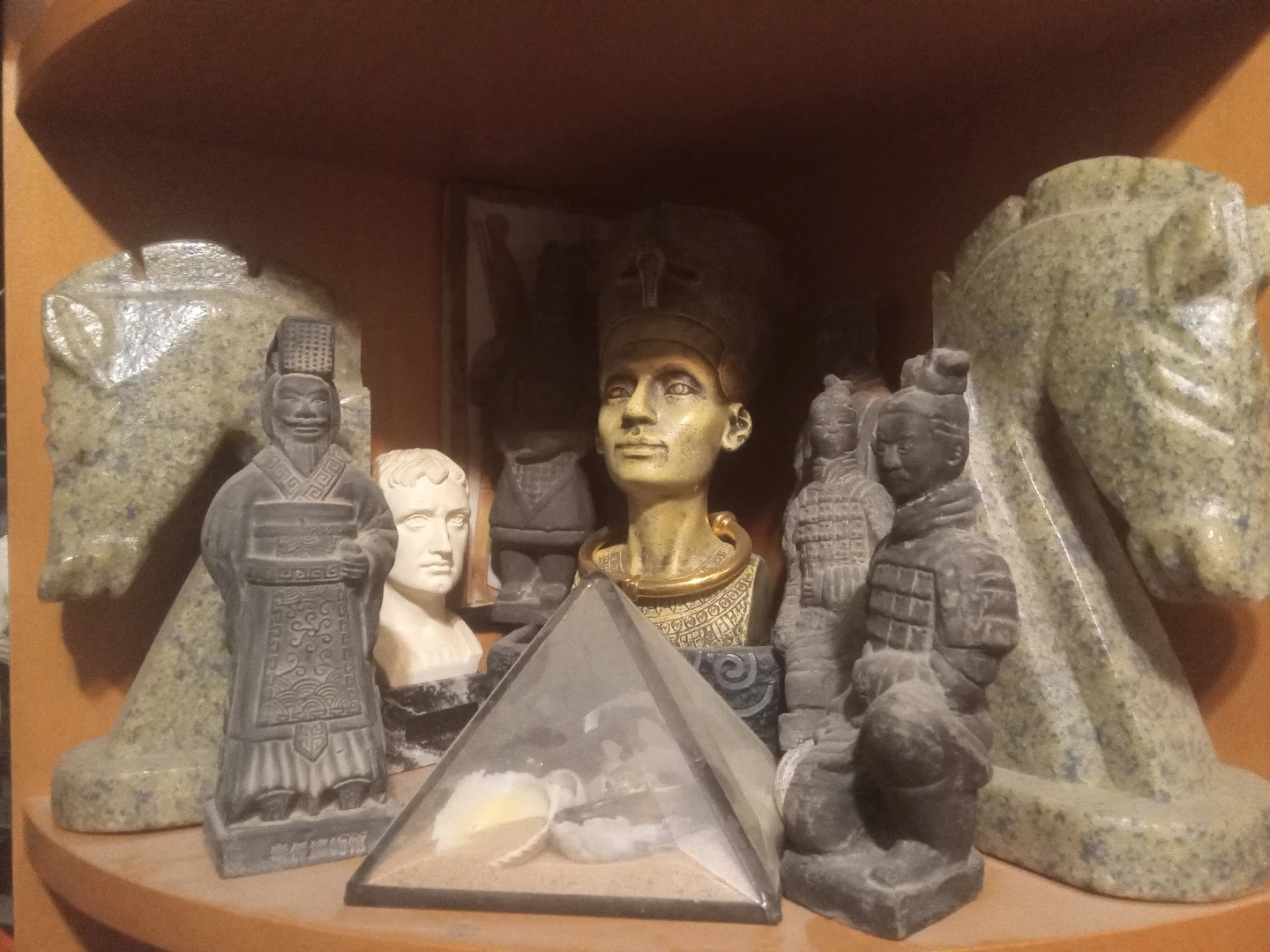 Collection of decorative statues including Egyptian bust, Chinese warriors, and historical figures. These items add a unique touch to any display shelf.