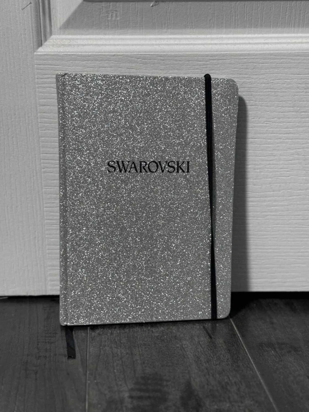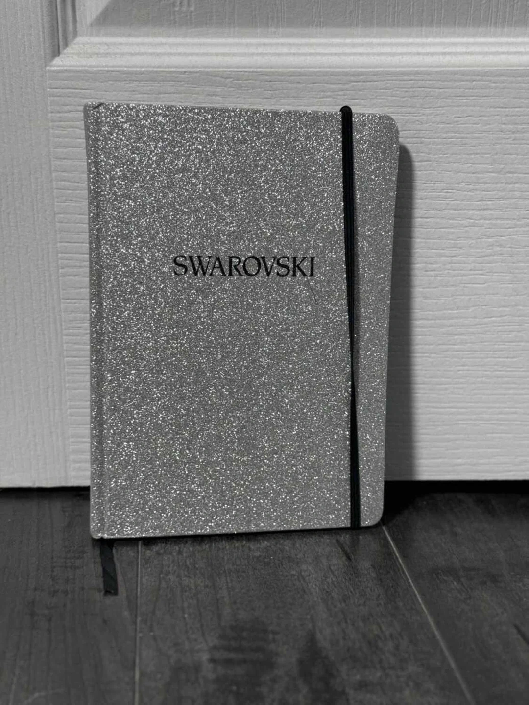 Sparkly silver notebook by Swarovski. Elastic band closure keeps it secure. It's perfect for jotting down thoughts or plans!