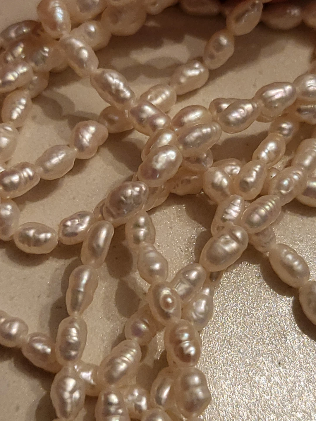 This elegant necklace features five strands of iridescent freshwater pearls. It's secured with a beautiful 14K gold clasp. Perfect for adding a touch of sophistication to any outfit!