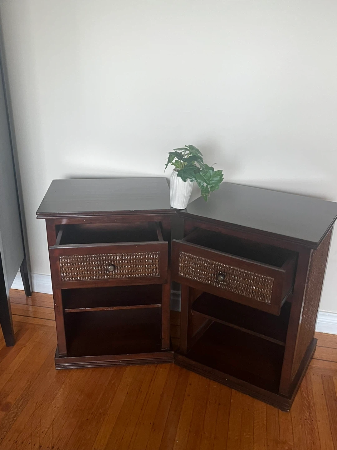 Pair of Dark Wood Nightstands with Woven Drawer Fronts