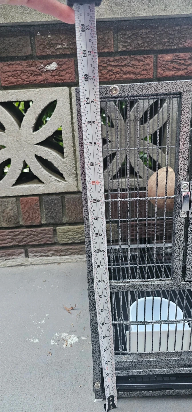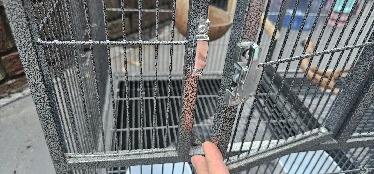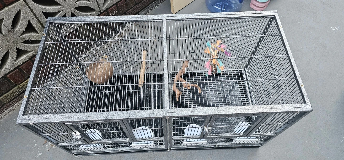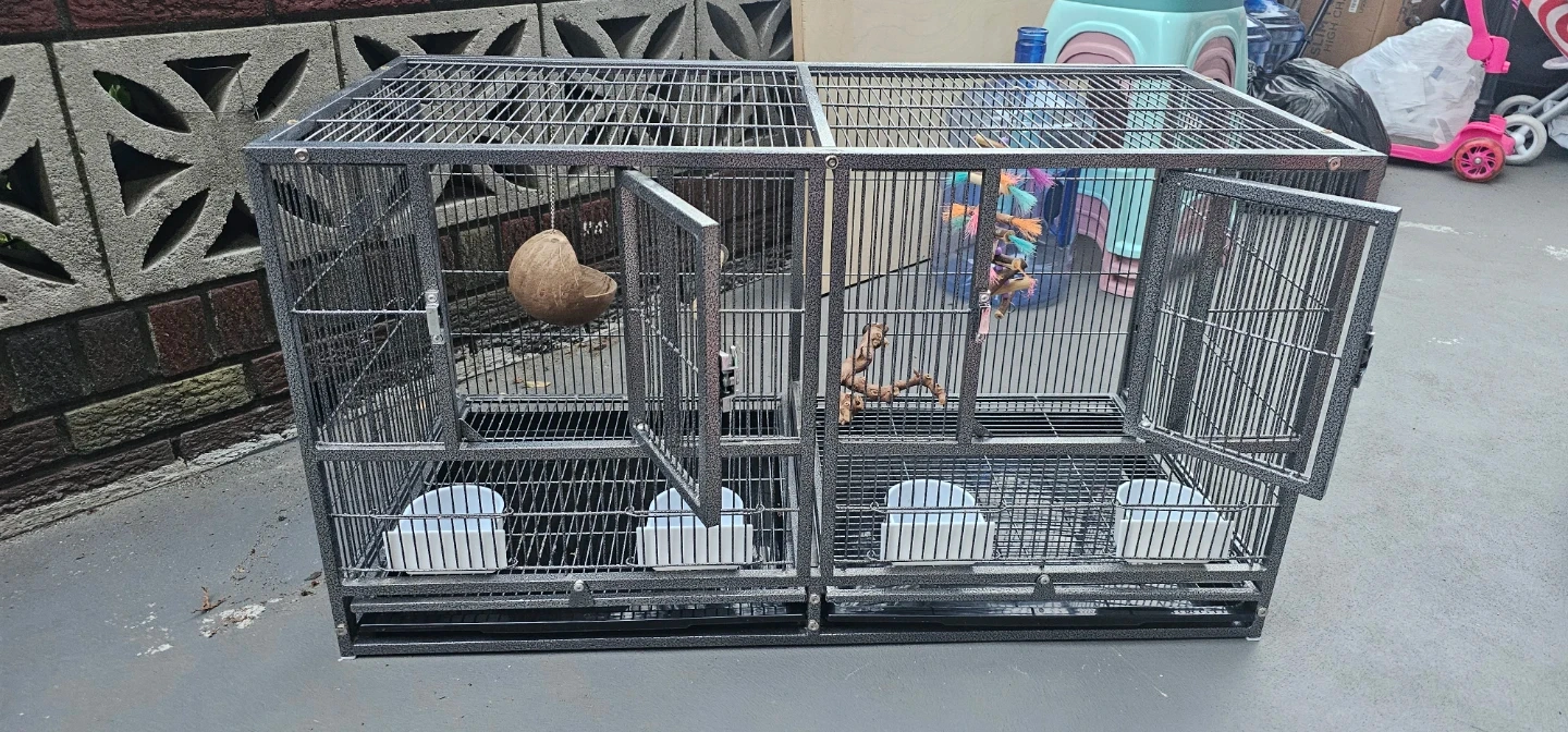 This is a large, 38W×18D×20H double-compartment bird cage. It's made of durable metal wire with a gray speckled finish. The cage includes four food and water bowls and multiple perches. Each compartment has a front door and a smaller access door.